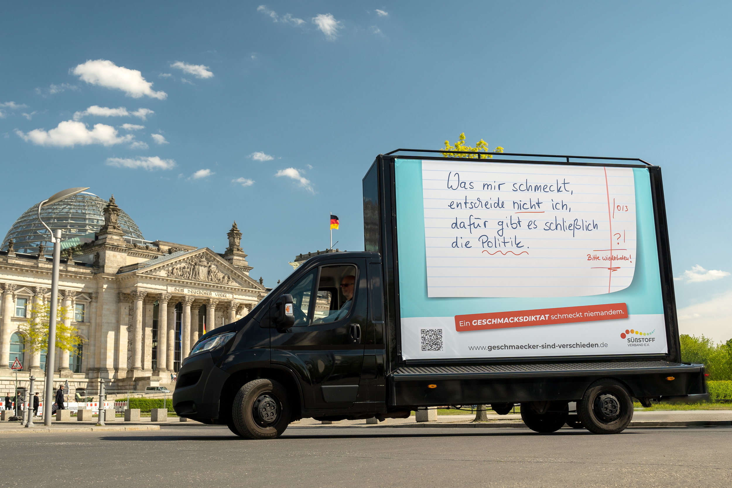 Mit der Kampagne #geschmaeckersindverschieden begleitet der Süßstoff-Verband stellvertretend für viele Verbraucher/-innen in Deutschland kritisch die aktuelle politische Debatte um Werbeverbote, Ernährungsstrategie und Reduktionsziele. Gestartet wurde die Kampagne mit einer Plakataktion in Berlin. Unter der Überschrift "Ein Geschmacksdiktat schmeckt niemandem" hat der Süßstoff-Verband im Mai 2023 ein klares Statement für Geschmacksvielfalt, ein großes Lebensmittelangebot sowie die freie Wahl der Verbraucherinnen und Verbraucher gesetzt.