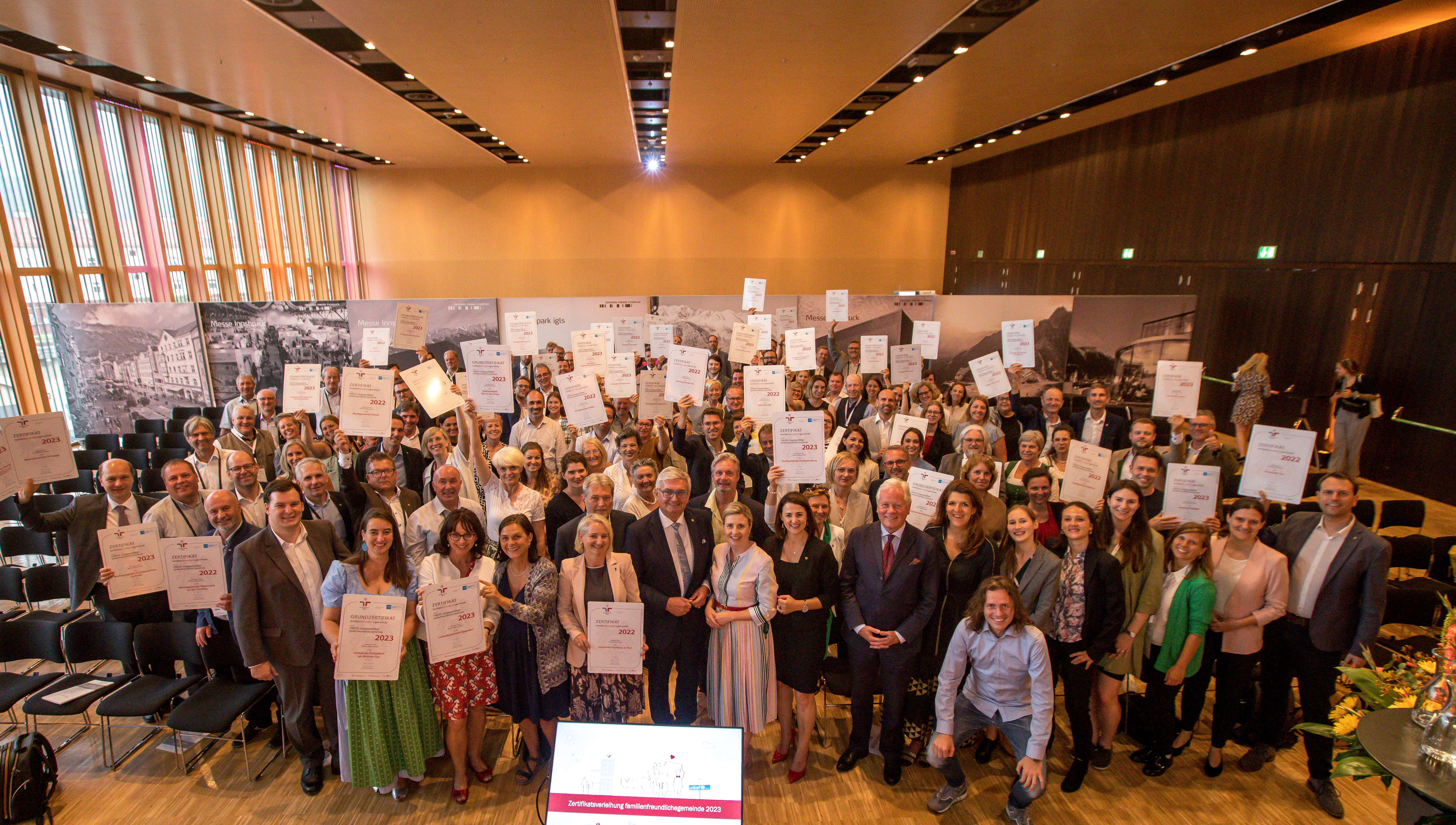 In einem feierlichen Rahmen wurden am 22. Juni 2023 auf der Kommunalmesse in Innsbruck insgesamt 118 Gemeinden und eine Region von MMag. Dr. Susanne Raab, Bundesministerin für Frauen, Familie, Integration und Medien, gemeinsam mit dem Präsidenten des Österreichischen Gemeindebundes, Bgm. Mag. Alfred Riedl, mit dem staatlichen Gütezeichen familienfreundlichegemeinde bzw. familienfreundlicheregion ausgezeichnet. „Familien bilden das Rückgrat der sozialen Strukturen der Gemeinden und damit der Gesellschaft. Daher ist die Unterstützung von Familien ein wichtiger kommunalpolitischer Faktor und eine gesamtgesellschaftliche Aufgabe“, betonte Susanne Raab. Alfred Riedl erläuterte zudem, dass durch die Zertifizierung „in den betreffenden Gemeinden das Bevölkerungswachstum und die Erwerbsquote erhöht und der gesellschaftliche Zusammenhalt gefördert werden. Familienfreundlich zertifizierte Gemeinden verfügen somit über wichtige Standortvorteile und wirksame Maßnahmen, um Abwanderung vorzubeugen“. Seit über 10 Jahren unterstützt der österreichische Gemeindebund die Gemeinden und Regionen auf ihrem Weg hin zu mehr Familienfreundlichkeit.