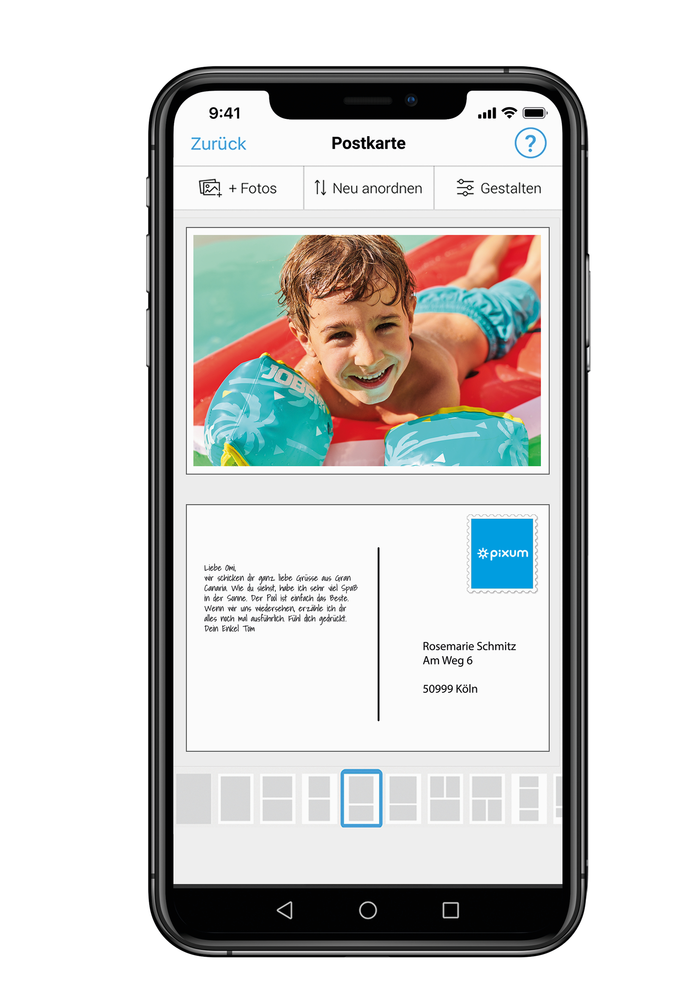 Mit der neuen Pixum Postkarte spart man nicht nur Zeit, weil man weder Briefmarken noch Briefkasten suchen muss. Sie lässt sich darüber hinaus mit nur wenigen Klicks, zu jeder Uhrzeit und von jedem Ort der Welt gestalten und verschicken (Internetverbindung vorausgesetzt). Und so einfach funktioniert's: Fotos auswählen, Postkarte in der Pixum App gestalten, Kurztext und Adresse hinzufügen, Postkarte mit dem Handy abschicken, fertig. Schon gehen die Fotos auf Reisen.