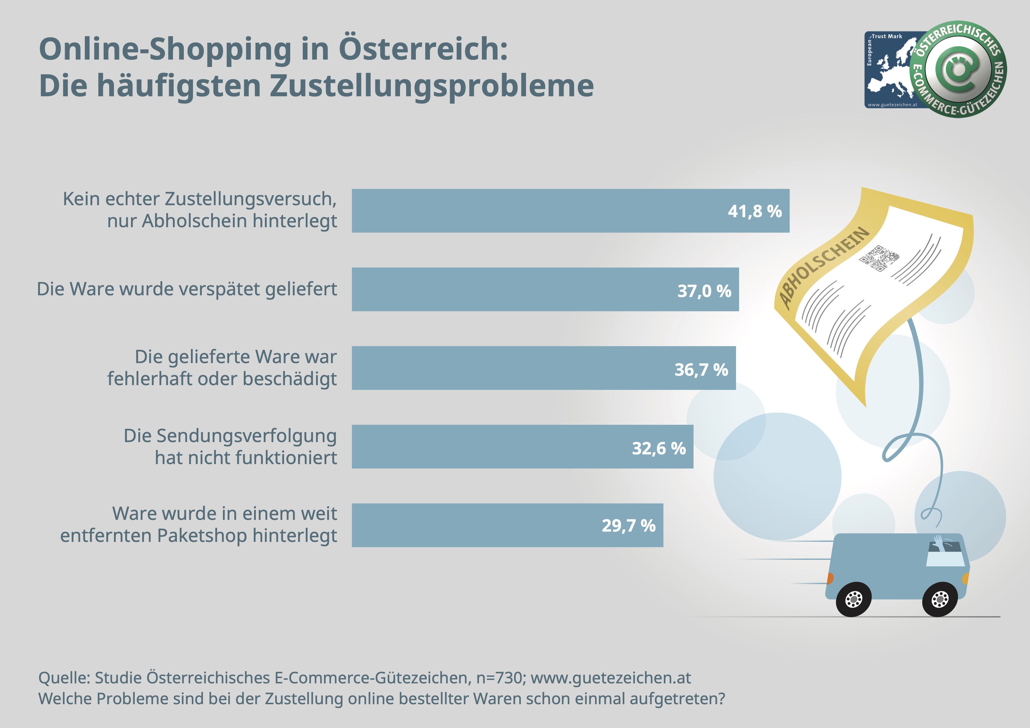 Das häufigste Ärgernis laut der Erhebung des Österreichischen E-Commerce-Gütezeichens ist für 42 Prozent der Online-Shopper, dass kein echter Zustellungsversuch erfolgt, sondern lediglich eine Benachrichtigung mittels Abholschein hinterlegt wird. Darauf folgen verspätete Lieferungen (37 Prozent) sowie beschädigte oder fehlerhafte Waren (37 Prozent).