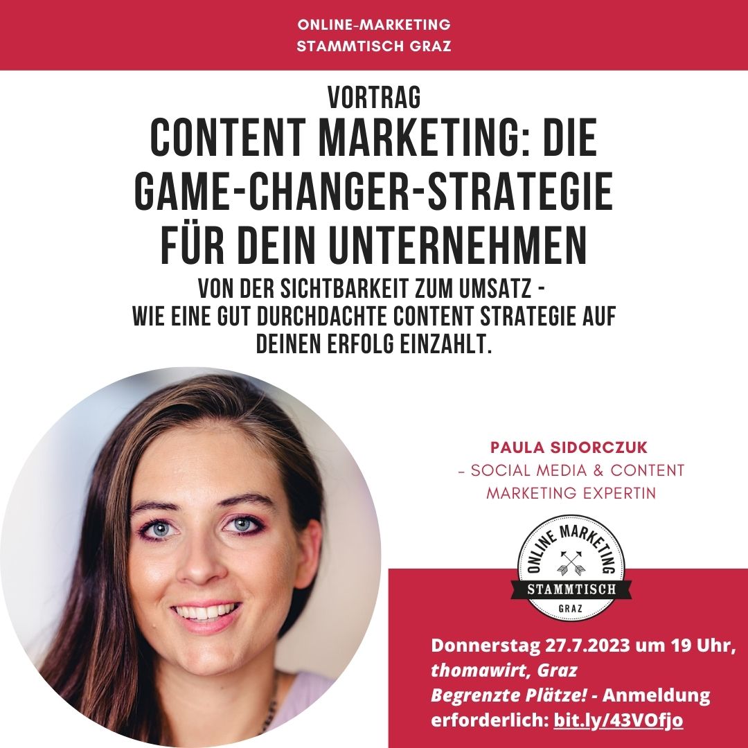 Beim Online Marketing Stammtisch Graz am 27. Juli wird Paula Sidorczuk berichten, wie eine gut durchdachte Content Strategie auf den Marketing-Erfolg einzahlt.