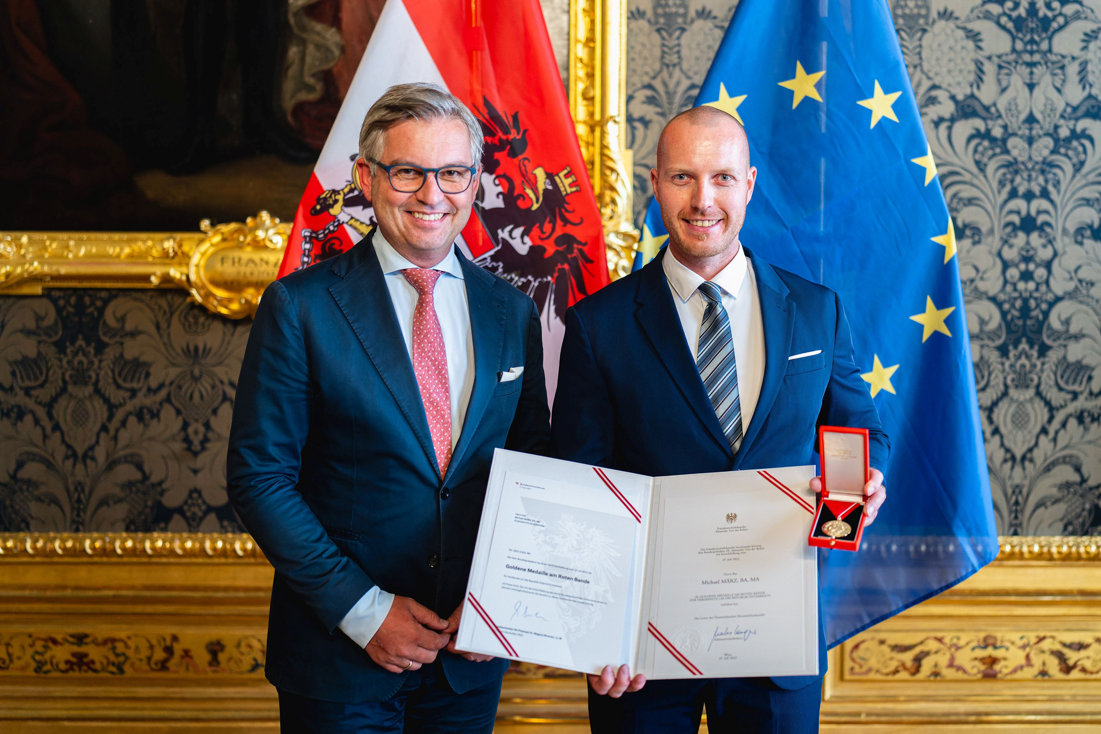 Finanzminister Magnus Brunner die Goldene Medaille am Roten Bande für