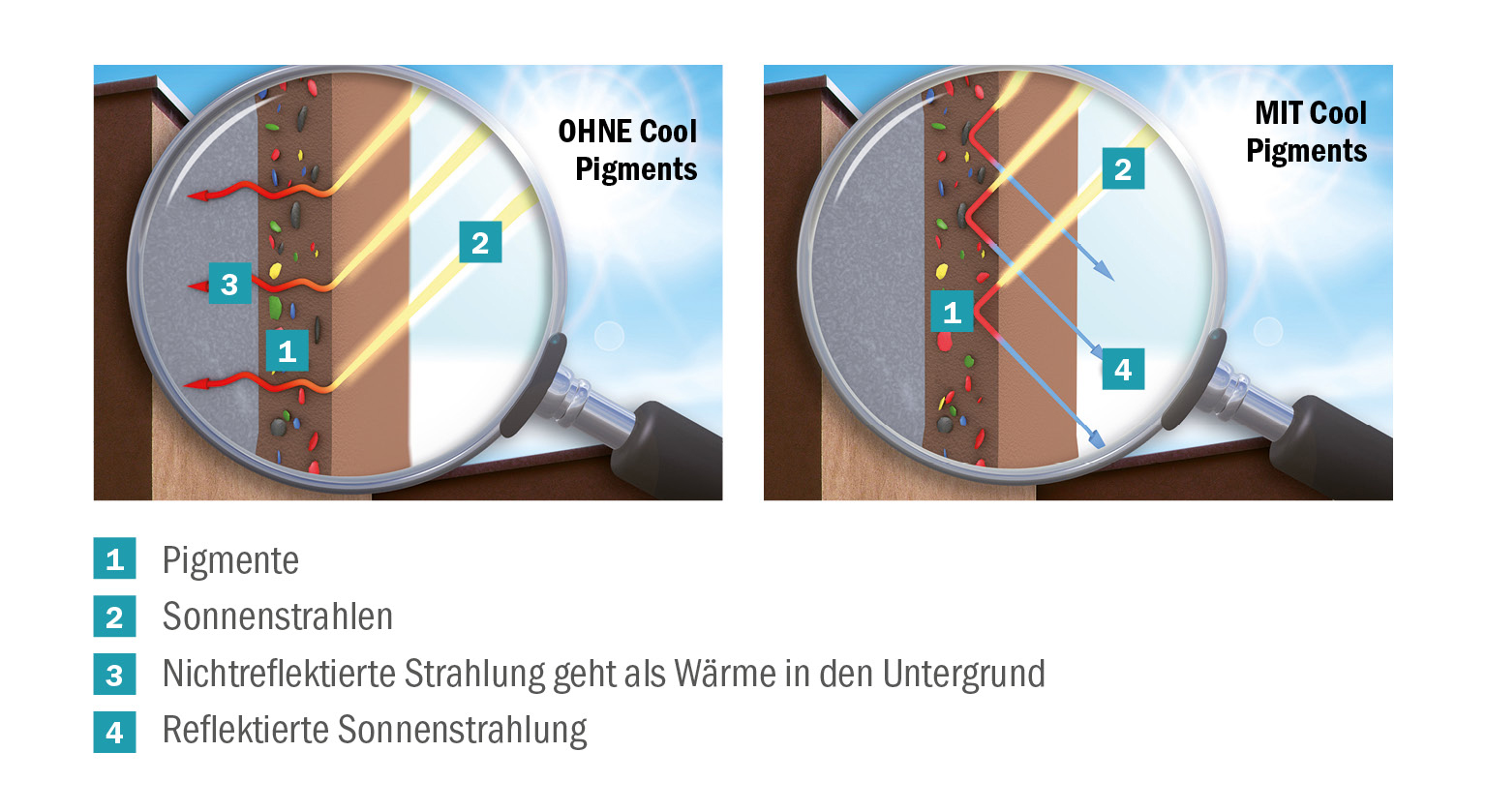 Die Begrünung von Gebäuden, Dächern und Fassaden in Kombination mit gezielt platzierten Wasserflächen verbessern nachweislich das Mikroklima in Städten. Innovative Technologien wie die Cool Pigment-Technologie von Baumit unterstützen den Kühlungs-Effekt noch zusätzlich. „Kühlende Farbpigmente in der Fassade reflektieren einen Teil des Sonnenlichtes und die Oberflächentemperatur der Gebäude sinkt dadurch