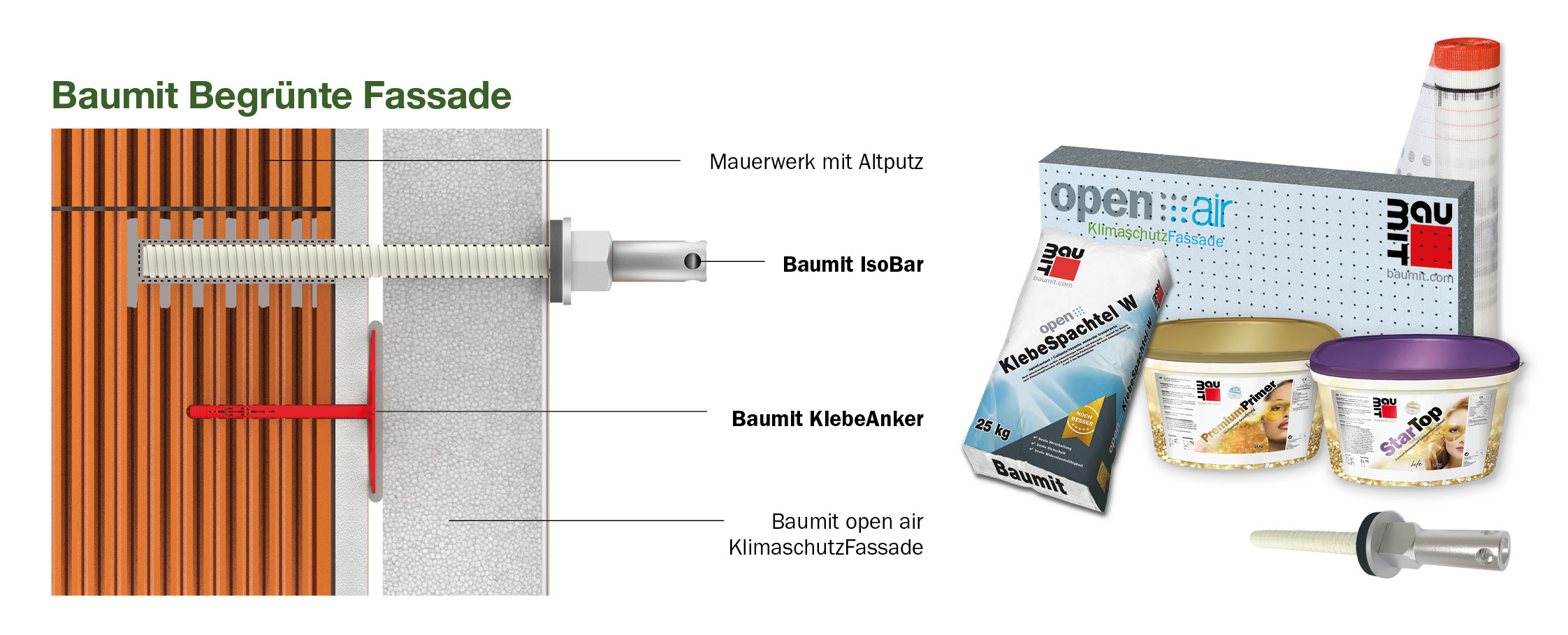 Damit eine Fassadenbegrünung funktioniert, muss sie zunächst mit einer passenden und richtig dimensionierten Dämmung ausgestattet sein. Beim Neubau ist das eine Selbstverständlichkeit, bei Gebäuden, die älter als 20 Jahre sind, sollte vor der Begrünung eine thermische Sanierung vorgenommen werden. Die Baumit open air KlimaschutzFassade vereint Klimaschutz und Dämmung in optimaler Weise. Sie ist ein Wärmedämmverbundsystem, das aus mehreren exakt aufeinander abgestimmten Komponenten besteht, die zusammen mit dem Montageelement Baumit IsoBar von EJOT für die perfekte Verankerung der Rankhilfen auf der Fassade sorgt.