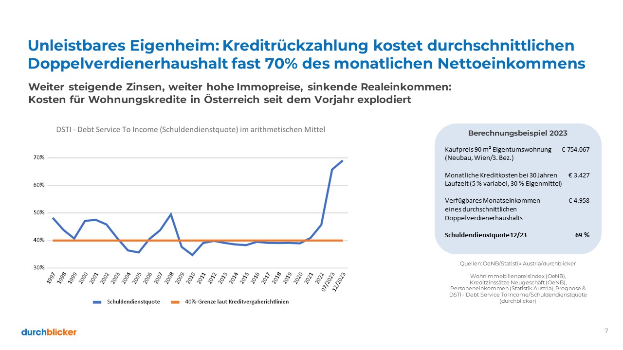 Der schnellste Anstieg der Notenbank-Zinsen in der österreichischen Nachkriegsgeschichte, zudem weiter hohe Immobilienpreise in Österreich und rapide sinkende Realeinkommen: Die relativen Kosten für einen Wohnungsneukauf in Österreich sind seit dem Vorjahr regelrecht explodiert. Musste ein durchschnittlicher Doppelverdienerhaushalt zur Tilgung eines Kredits für eine 90-m²-Neubauwohnung in Wien jahrzehntelang um die 40 Prozent des Monatseinkommens aufwenden, wären es jetzt fast 70 Prozent, zeigt eine aktuelle Analyse von Österreichs größtem Tarifvergleichsportal durchblicker, die am Donnerstag veröffentlicht wurde.