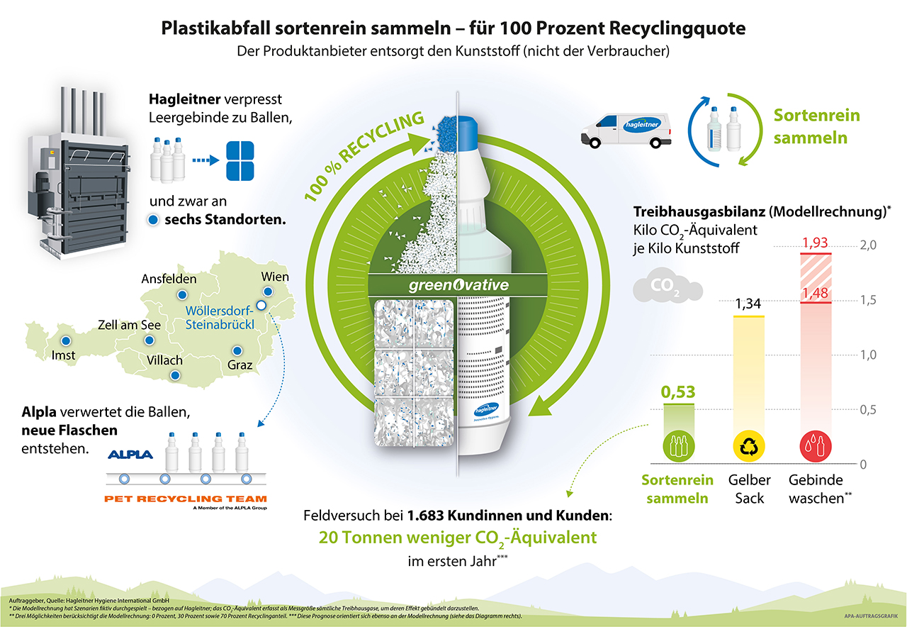 Der Salzburger Hygienehersteller Hagleitner will ein landläufiges Verwertungs-Dilemma lösen: „Plastikabfall zu sammeln, ist gut; dafür finden sich Annahmestellen. Noch besser aber wird Kunststoff-Recycling, wenn es sortenrein passiert. Dann unterbleiben Fehlwürfe, dann wird überhaupt nichts mehr verbrannt. Fehlwürfe sind sonst unvermeidlich – normalerweise landet ihretwegen immer ein Teil des Plastikabfalls im Feuer, das betrifft selbst den Gelben Sack.“ So spricht Hans Georg Hagleitner. Seine Firma hat am 1. August 2023 einen Feldversuch gestartet, es geht um Flaschen und Kanister für Reinigungsmittel. „Das Thema ist ein Perspektivenwechsel: Nicht der Verbraucher entsorgt das Gebinde, sondern der Anbieter.“ Hagleitner holt die Verpackung zurück, sobald sie leer geworden ist. Eine neue Flasche bläst daraus Alpla, der Kunststoffspezialist aus Vorarlberg. Erheblich minimiere sich hiermit der Klima-Fußabdruck, er mache dann nur mehr gut ein Drittel aus. Das ergibt eine Modellrechnung, die Szenarien fiktiv durchgespielt hat.