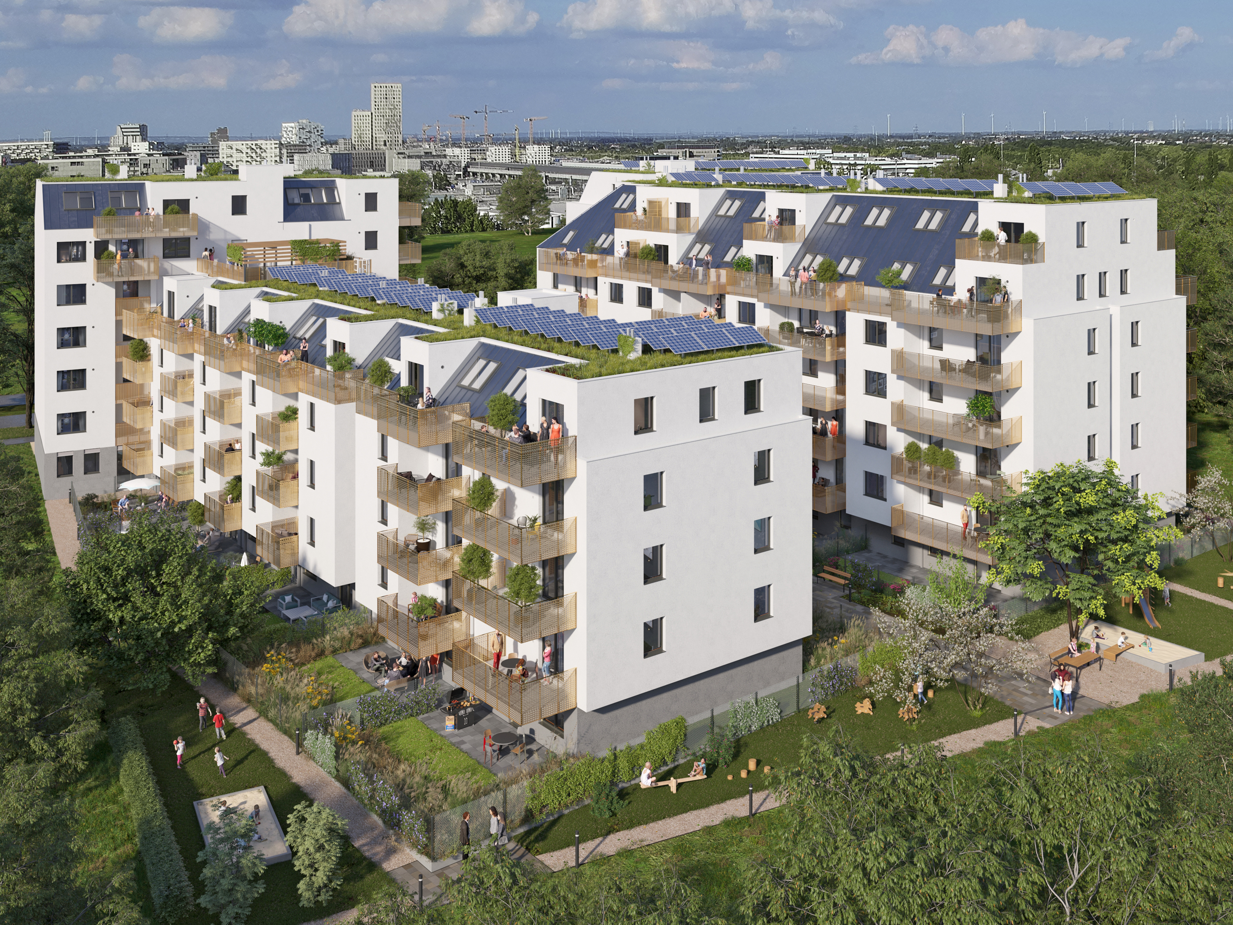 - Innovative Wohnungsgrundrisse für alle Nutzergruppen, zahlreiche Homeoffice-Kojen, ausgedehnte Grünflächen, Kinderspielplätze und digitale Lösungen