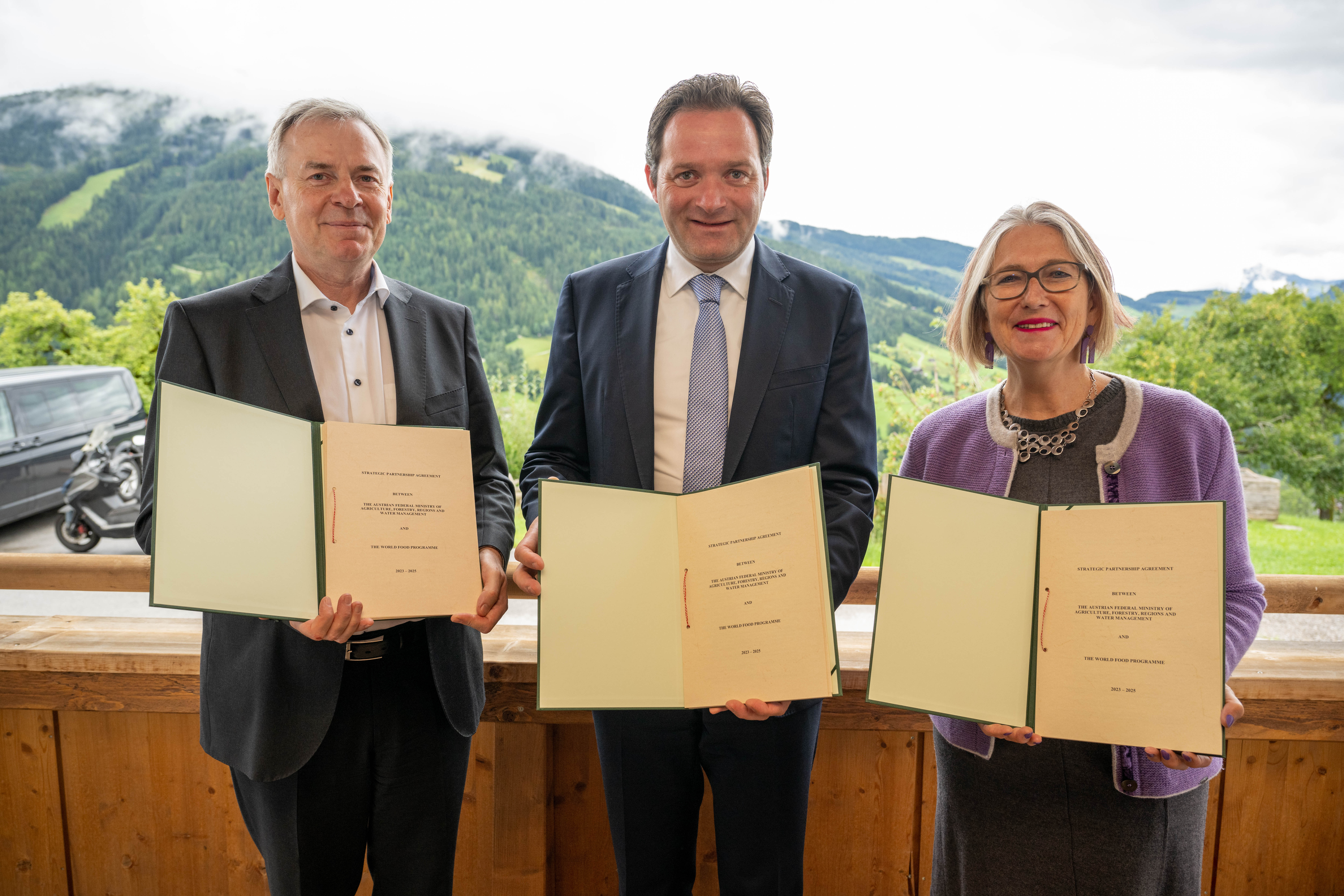 Landwirtschaftsminister Norbert Totschnig unterzeichnete gemeinsam mit Ute Klamert, beigeordnete Exekutivdirektorin des Welternährungsprogrammes der Vereinten Nationen (WFP), eine dreijährige Strategische Partnerschaft für Nahrungsmittelhilfe am Rande des Europäischen Forum Alpach. Bei der Umsetzung der Strategischen Partnerschaft unterstützt die Austrian Development Agency (ADA), welche durch den Leiter und Botschafter Friedrich Stift in Alpbach vertreten war.