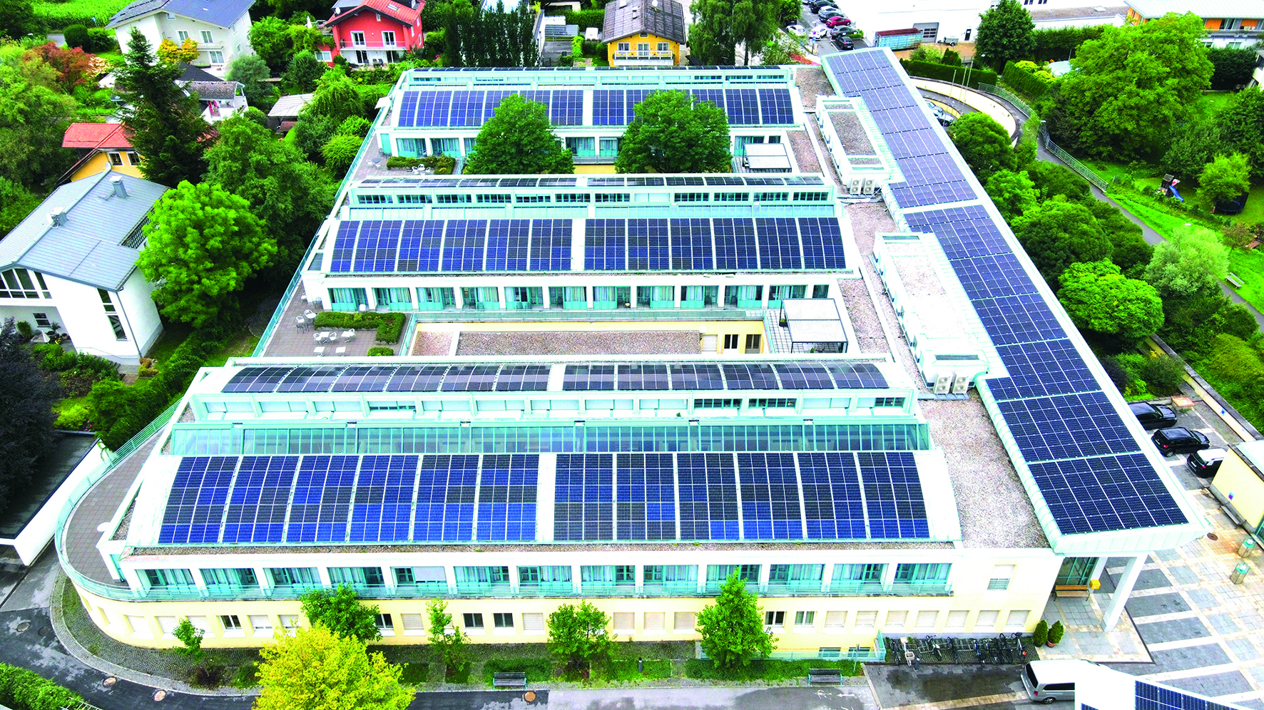 924 Solarmodule konnten bei der Errichtung der neuen Photovoltaikanlage der Privatklinik Wehrle-Diakonissen auf einer Fläche von 1.800 Quadratmetern verbaut werden. „Nahezu optimale bauliche Gegebenheiten ermöglichten uns die Ausnutzung der gesamten Dachfläche der Klinik