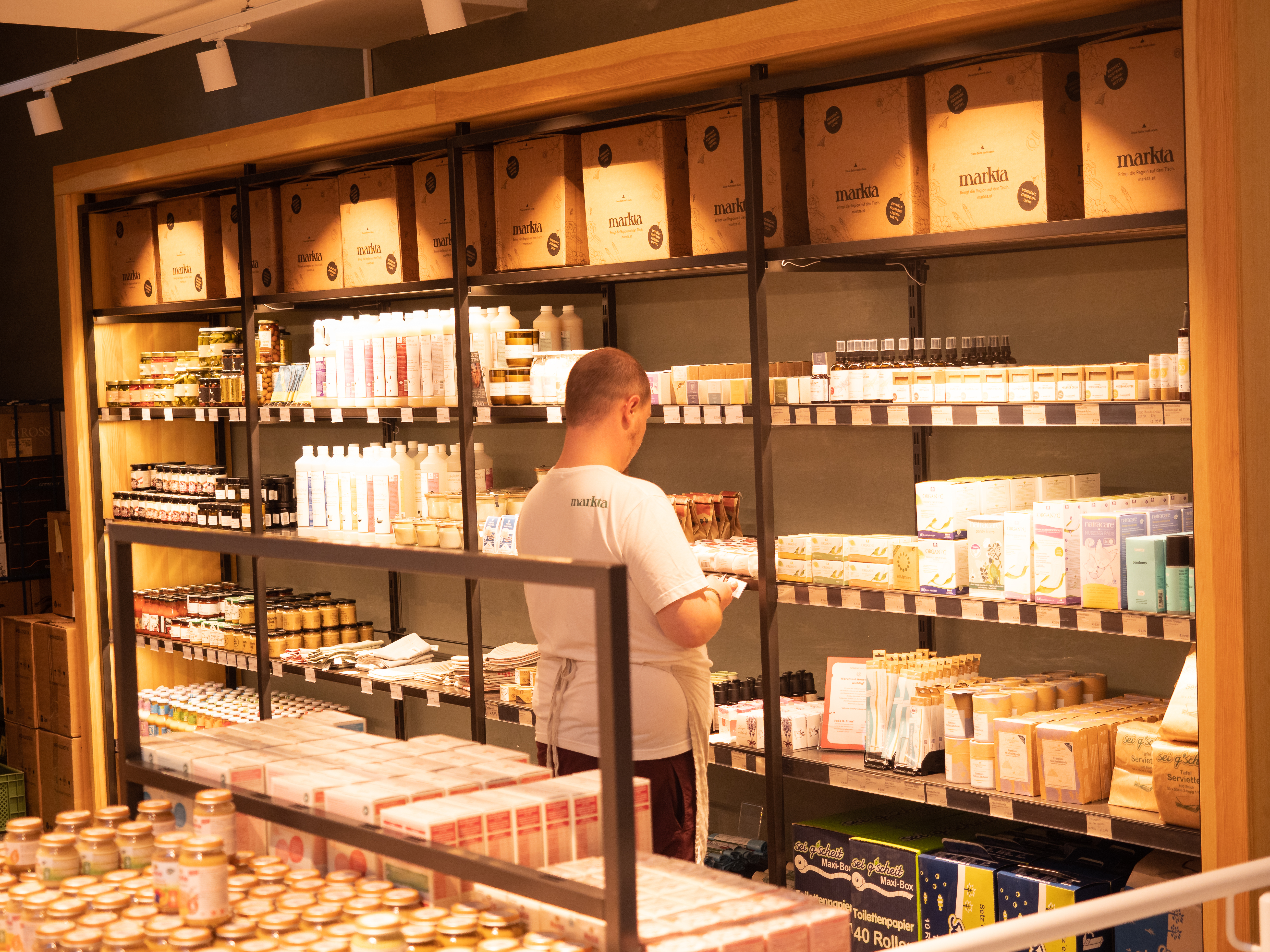 Auf knapp 400 m2 bietet markta in der Alser Straße 16 im 9. Wiener Gemeindebezirk nun Produkte aus der Region. „Unser Lebensmittelmarkt bietet ein Vollsortiment aus regionaler und nachhaltiger Produktion an: ob Bio-Rindfleisch aus dem Waldviertel, Gemüse aus der Donaustadt oder Seife aus der Obersteiermark. Der Einsatz von Naturmaterialien, ein großer Baum und die entspannte Atmosphäre entschleunigen den Einkauf“, freut sich Geschäftsführer Julian Hödlmayr.