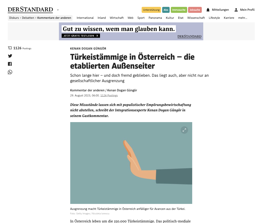 Der Versuch, einer pauschal vorverurteilenden und abwertenden Überschrift im Standard vom 29.08.2023 mit dem belastenden Foto „Türkeistämmige in Österreich – die etablierten Außenseiter. Schon lange hier – und doch fremd geblieben.Das liegt auch, aber nicht nur an gesellschaftlicher Ausgrenzung“ von Herrn Kenan Güngör ist als Expertenrat der Bundesregierung der Republik Österreich für Integration ist nicht nur bedenklich, sondern leider auch mit “Kulturalismus” (Neorassismus, Rassismus ohne Rassen) und vor allem mit Verantwortungslosigkeit behaftet.