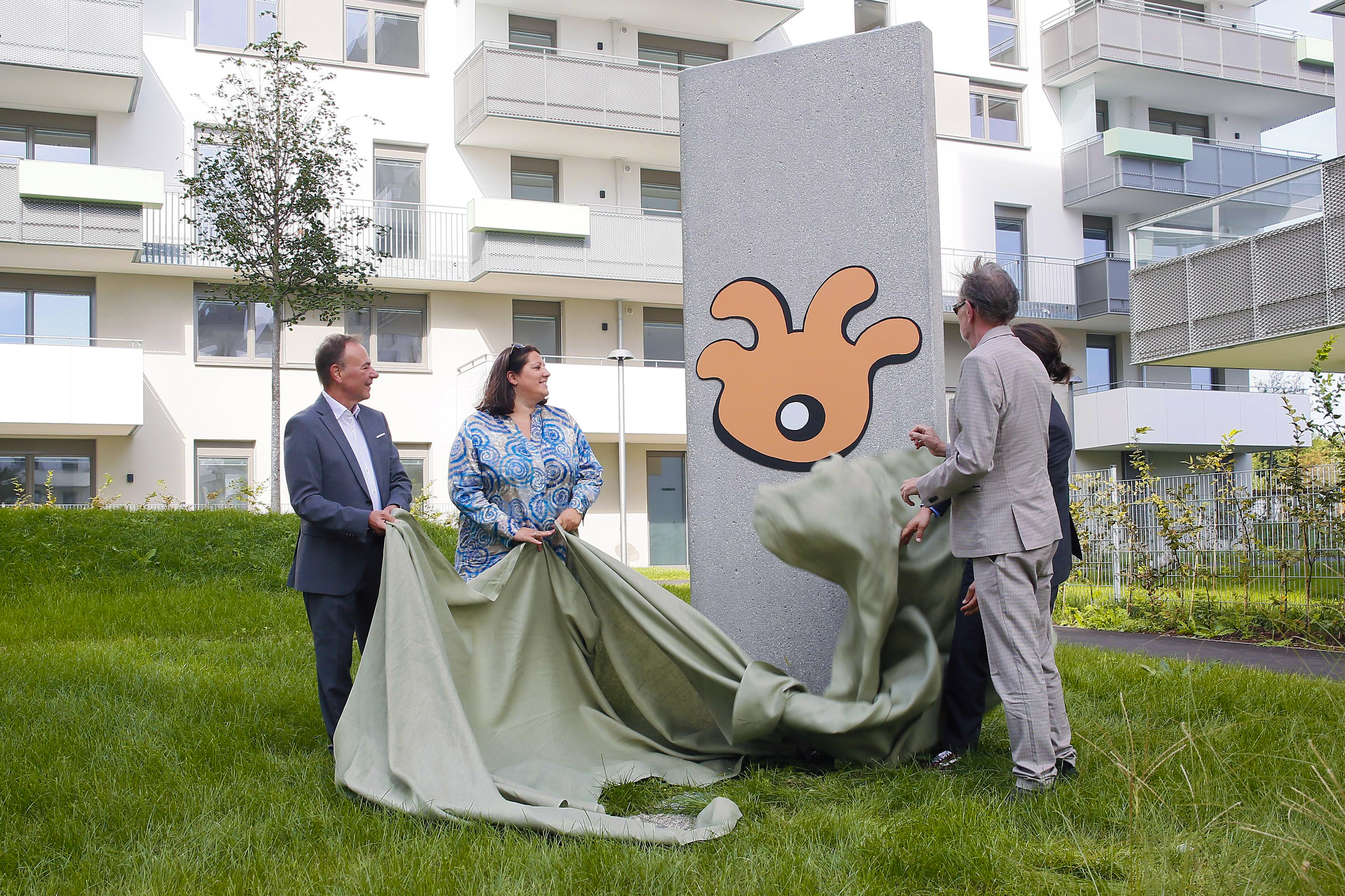 Zusätzlich ist es der „Wien-Süd“ auch diesmal wieder gelungen, mit dem bekannten Zeichner und Cartoonisten Rudi Klein für die von der Genossenschaft 2010 gestartete Initiative „Kunst am Bau“ einen großen Namen zu gewinnen. Er gestaltete die fünf im Freibereich errichteten Stelen sowie den Innenbereich des Entrees von zwei Stiegen. Damit konnte die „Wien-Süd“ erneut beweisen, dass diese Initiative keineswegs Luxus darstellt. Vielmehr stellt die Initiative „Kunst am Bau“ eine zusätzliche Bereicherung der Lebens- und Wohnqualität dar., mit einem Anteil des dafür vorgesehenen Budgets von 0,05 bis 0,1 Prozent am gesamten Bauvolumen. Sie bereichert dieses Wohnquartier, indem sie Identifikationsmöglichkeiten für die Bewohnerinnen und Bewohner schafft und die Wohnqualität zusätzlich steigert. Darauf gingen auch Vizebürgermeisterin und Wohnbaustadträtin Kathrin Gaál, Bezirksvorsteher Gerald Bischof, „Wien-Süd“-Vorstandsvorsitzender Andreas Weikhart und Rudi Klein in ihren Pressestatements ein.