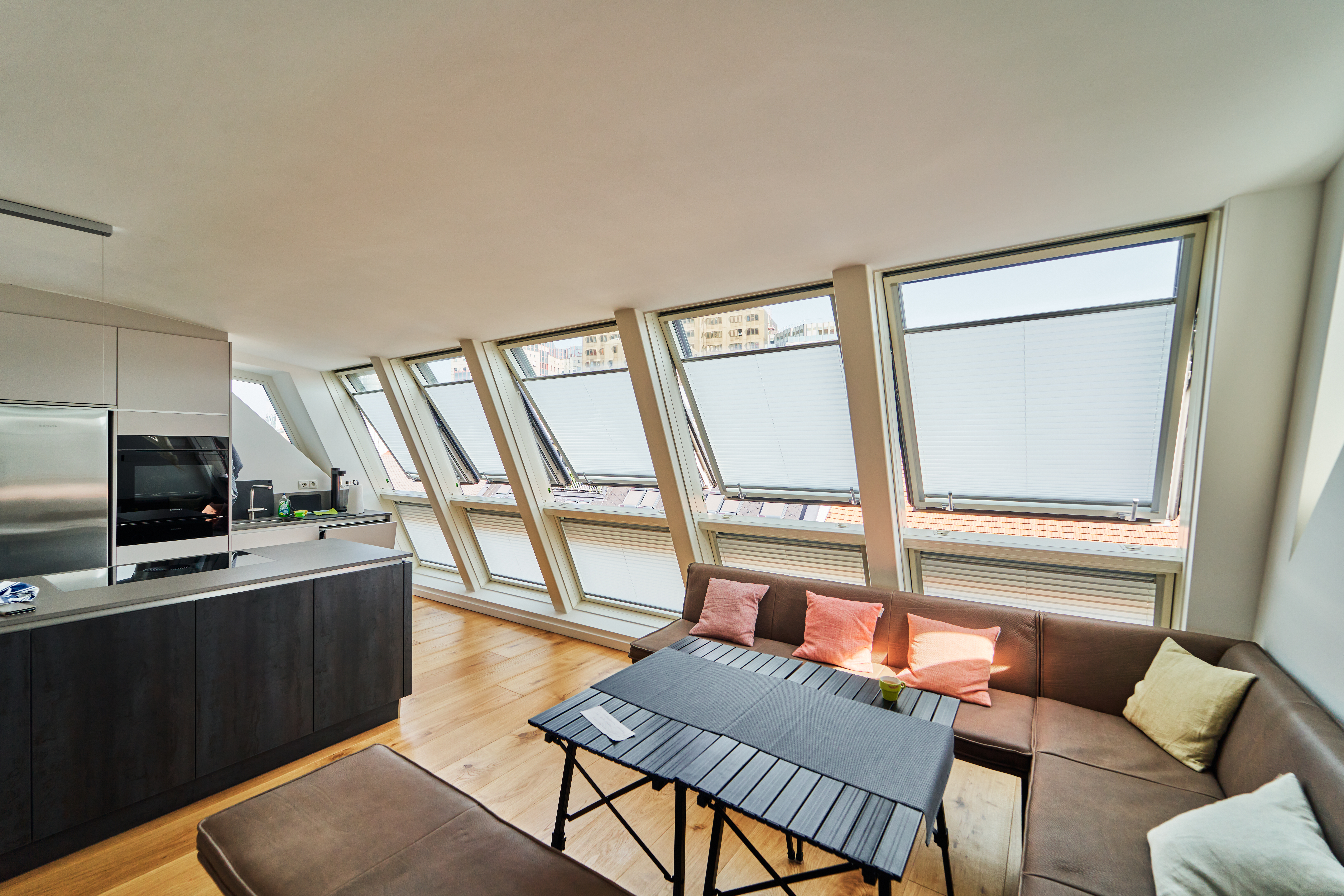 Auf zwei Dachgeschoßebenen befinden sich insgesamt vier sonnendurchflutete Dachgeschoßwohnungen. Mit dem Aufzug gelangt man direkt in die Penthouse-Wohnung im zweiten Dachgeschoß. Betritt man die Wohnung, führen einige Treppenstufen in den weitläufigen Wohnbereich mit Küche. Das Besondere daran ist, dass dieser Dachgeschoßraum ganz ohne Dachschrägen auskommt. Möglich wird dies durch eine beeindruckende raumgroße, verglaste Gaube. Mehrere Fensterflächen aneinander gereiht verleihen dem Wohnraum Großzügigkeit und eine ansprechende Ästhetik. Die weiteren Räume wie das Schlafzimmer und das Badezimmer, sind als Steildach ausgeführt und mit FAKRO Dachfenstern ausgestattet. Sie lassen viel Tageslicht in die Innenräume, sorgen für ein angenehmes Raumklima und sparen Heiz- und Kühlenergie. Für mehr Privatsphäre sorgen die innenliegenden, weißen FAKRO Faltstore APS, die ein sanftes, gedämpftes Licht und ein harmonisches Farbenspiel im Raum bewirken. Das stufenlose Regulieren des Lichteinfalls erlaubt ein individuelles Verschieben von oben und unten.