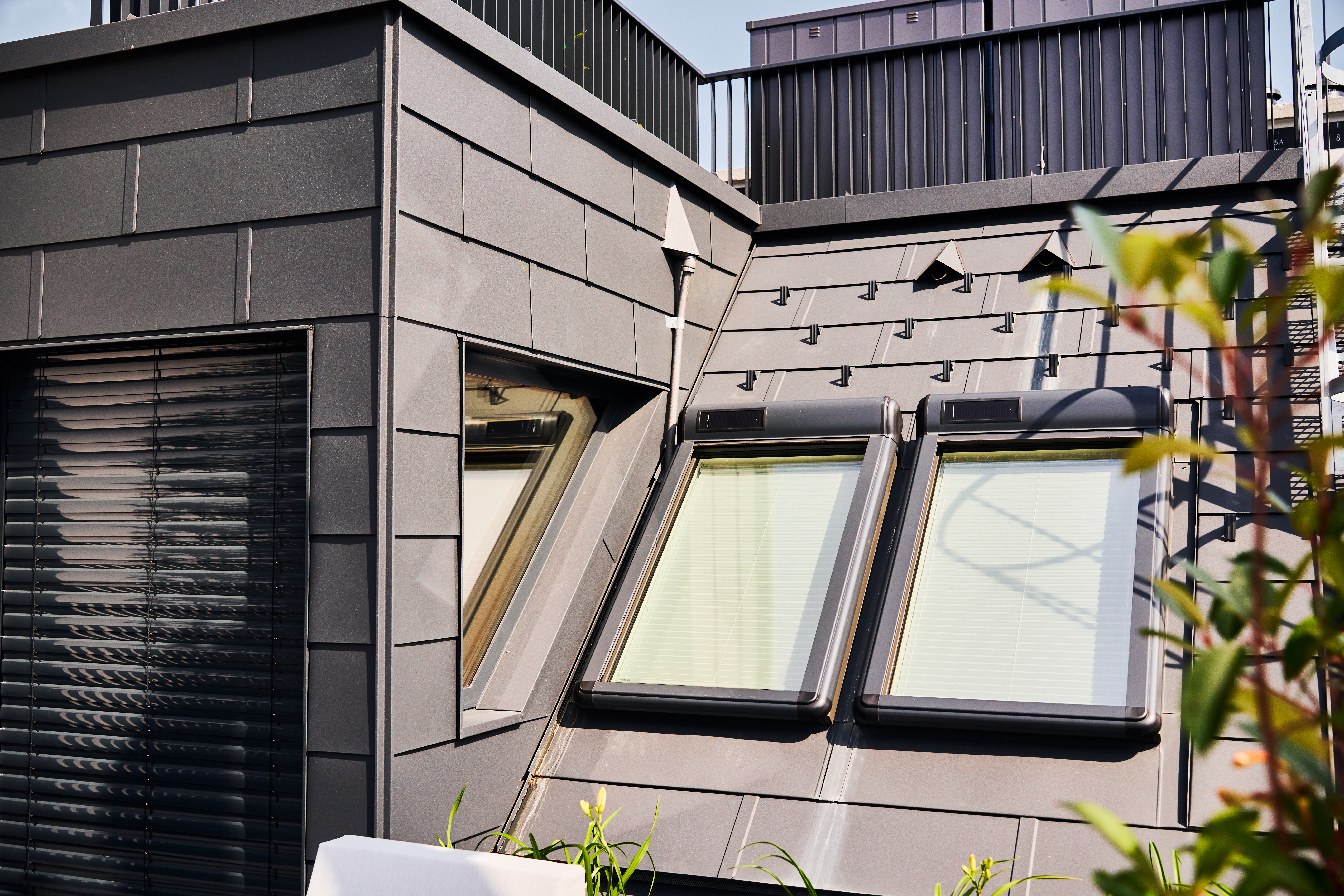 , so Carsten Nentwig, Geschäftsführer FAKRO Österreich. Für dieses besondere Bauvorhaben hat Dachfensterhersteller FAKRO eine Sonderlösung gemeinsam mit dem Bauträger 3SI Immogroup erarbeitet. Im Wohnraum des obersten Geschoßes ohne Dachschrägen wurden insgesamt fünf FAKRO FPU P5 Niedrigenergie-Klapp-Schwingfenster preSelect MAX in eine spezielle Dachkonstruktion eingebaut. Die darunter liegenden Fixelemente FAKRO FXU P5 sind direkt an die FAKRO Dachfenster gekoppelt. „Die Fenster sind in einem Lichtband integriert und es wurden sogenannte Blindelemente mit einer Reflexionsscheibe verbaut, um die Optik beizubehalten, da in manchen Bereichen Stahlträger durch die Fenster laufen und diese so nicht sichtbar sind“