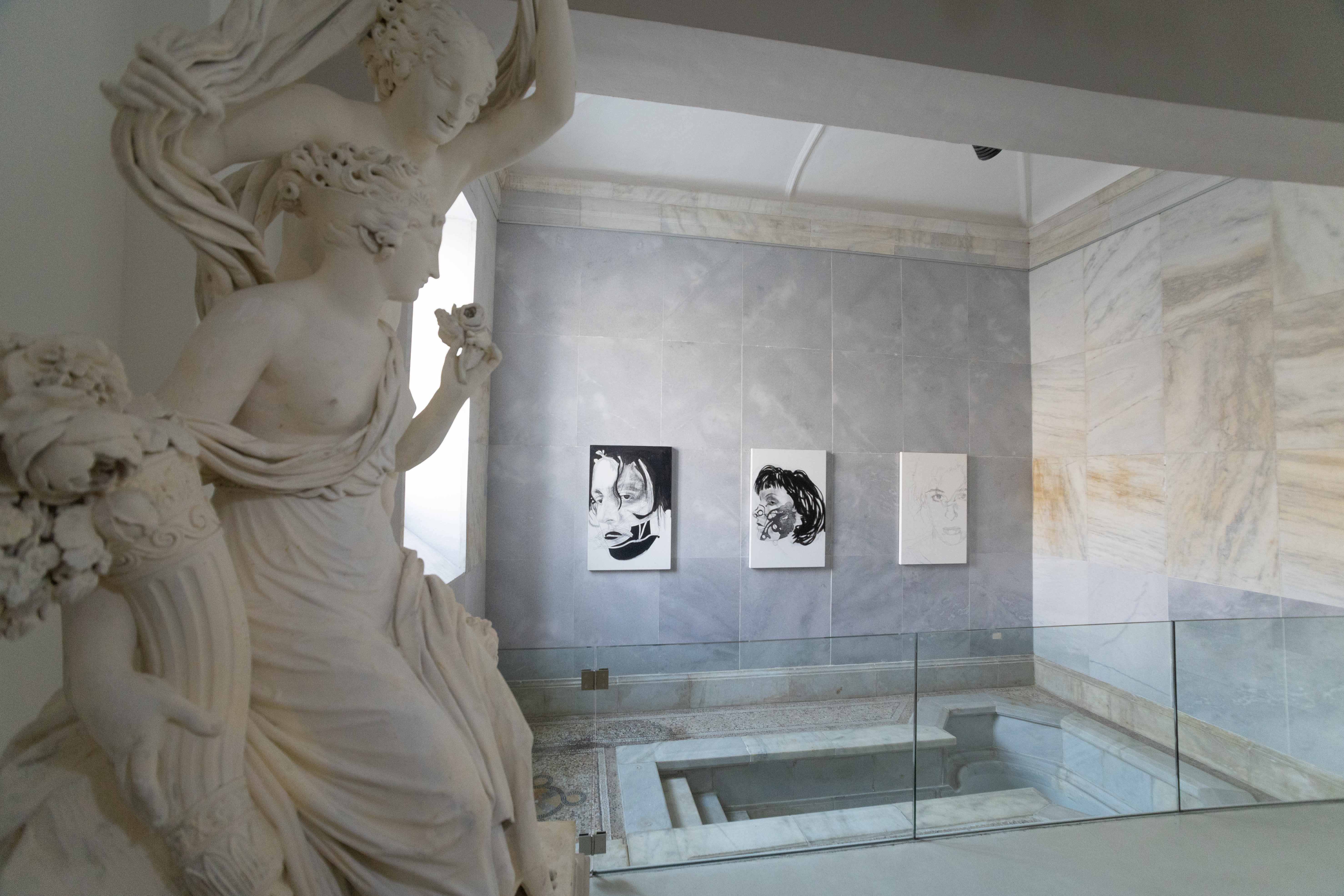 Eine Idee, die bereits mehreren Ausstellungen des Hauses zugrunde lag, nämlich Rainers Werk anderen künstlerischen Positionen gegenüberzustellen, wird in der aktuellen Schau aufgegriffen und „transponiert“: Dem Motiv „Duette Duelle“ folgend sind großformatige Gemeinschaftsarbeiten von Brigitte Kowanz und Franz Graf aus den frühen 1980er-Jahren in den Marmorbädern des ehemaligen Frauenbades zu sehen.