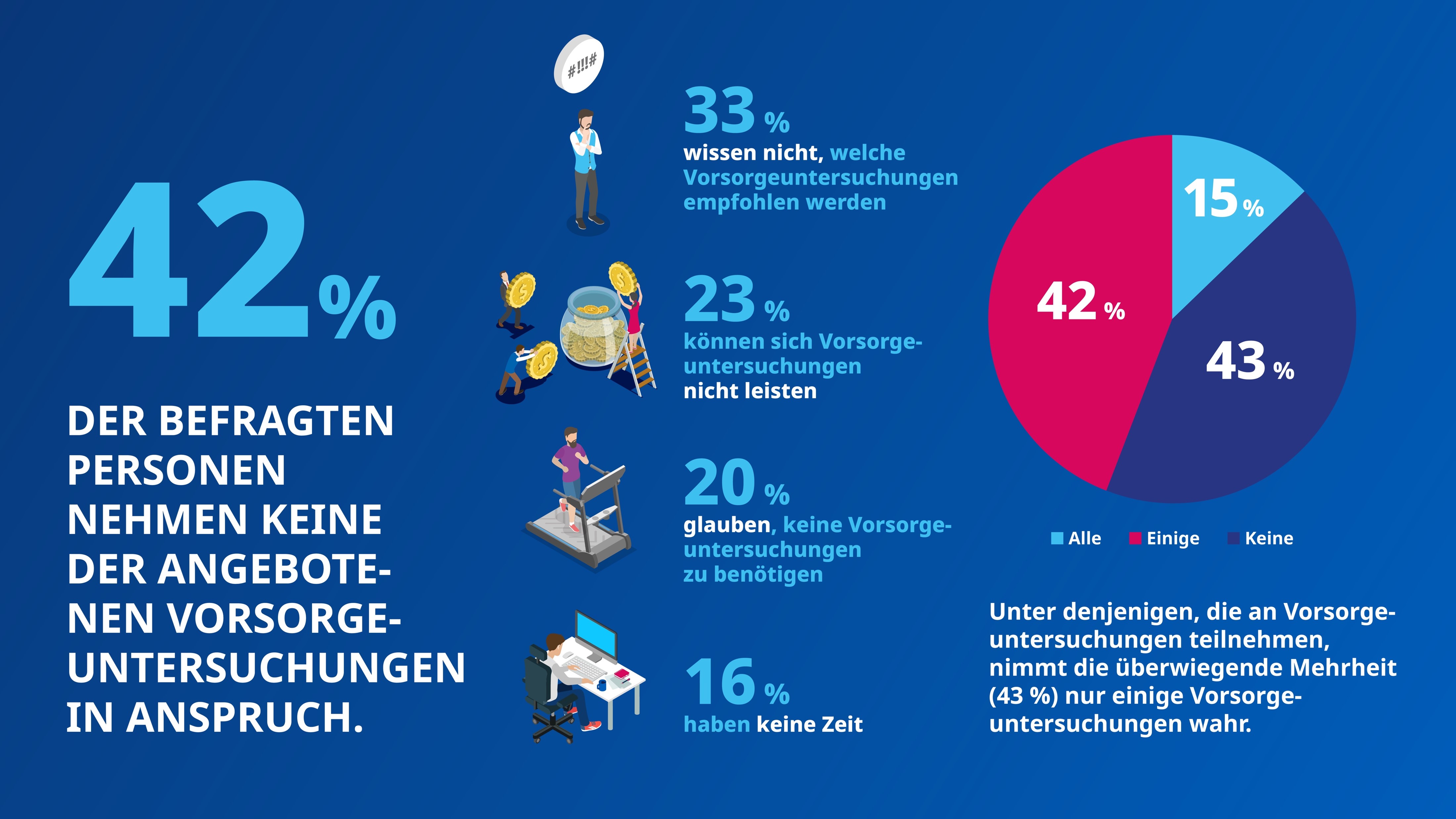 Die Österreicher handeln proaktiv, wenn es um die Gesundheit geht. In Österreich liegt die Inanspruchnahme aller Vorsorgeuntersuchungen über dem globalen Durchschnitt. Die wichtigsten Vorsorgeuntersuchungen der Österreicher sind Gynäkologie (45 %), Zahnarzt (69 %), allgemeine Gesundenuntersuchung (68 %), Blutbild (49 %) und Prostata-Screening (48 % der Männer). Sie gehen aber auch häufiger zum Hautkrebs-Screening und zur Gastroskopie als der weltweite Durchschnitt. Insgesamt sind Vorsorgeuntersuchungen in Österreich deutlich besser verfügbar als im globalen Durchschnitt.