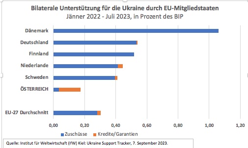 Österreich gehört zu den reichsten Ländern der Welt. Ohne ausländische Hilfe nach Ende des 2. Weltkriegs gäbe es diesen Wohlstand nicht. Österreich ist aber seit Jahren knausrig gegenüber Staaten, die auf Hilfe angewiesen sind. Österreich liegt beim Vergleich der gesamten Unterstützung für die Ukraine nur im unteren Drittel aller EU-Länder und weit hinter den Ländern mit vergleichbaren Pro-Kopf-Einkommen liegt. Ähnliches gilt seit Langem für die gesamte Entwicklungszusammenarbeit.