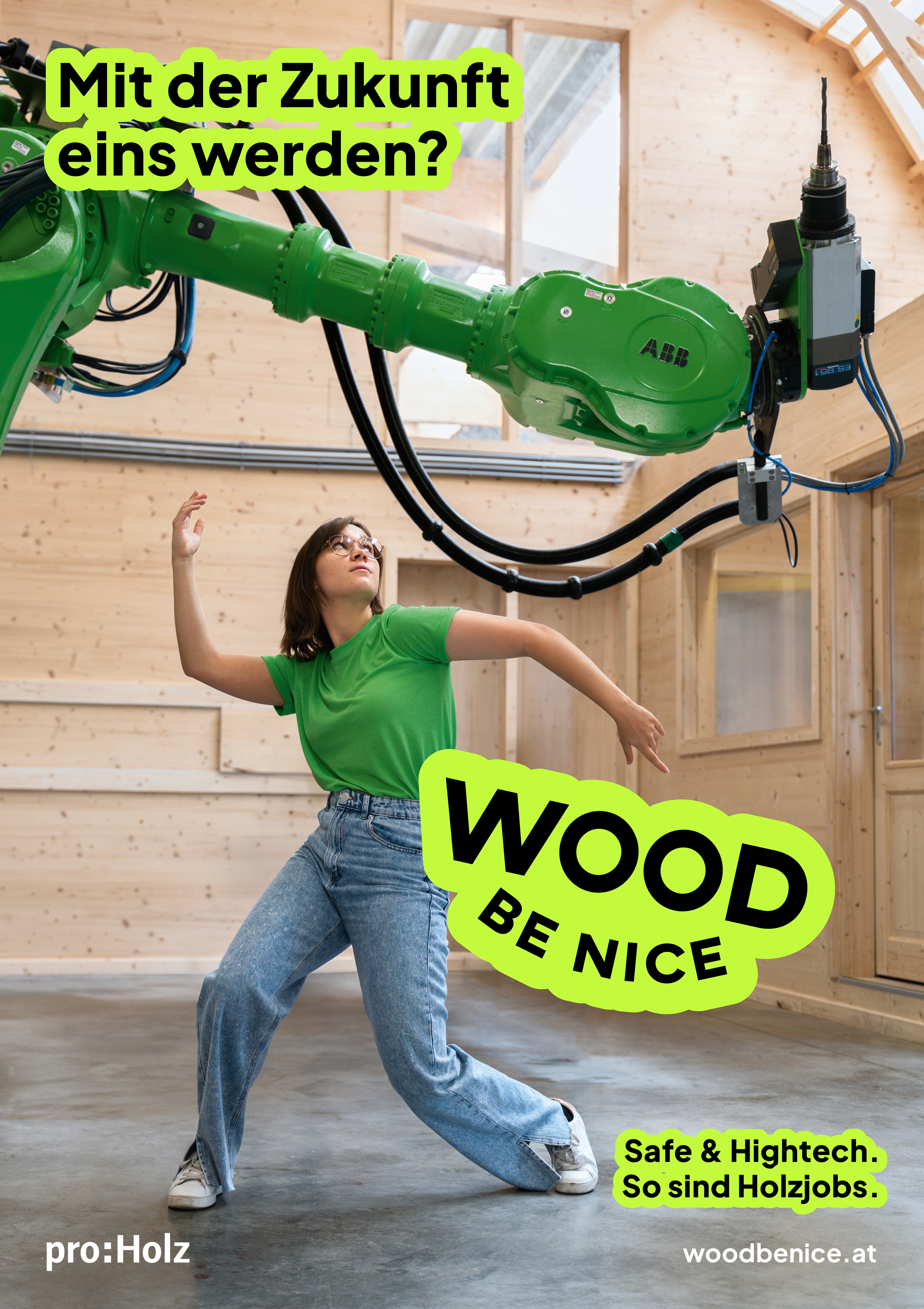 Die Kampagne „Wood be nice“, die proHolz Austria gemeinsam mit der Linzer Agentur „Gruppe am Park“ entwickelt hat und für die Branche umsetzt, spricht junge Menschen als Nachwuchskräfte für die Holzwirtschaft an. Kurzvideos werfen überraschende Blicke auf die Arbeitswelt Holz und greifen zentrale Werte der Generation Z wie Naturverbundenheit, Sicherheit, Technologieoffenheit und Selbstbestimmtheit – Werte, denen die Holzwirtschaft optimal entspricht – auf.