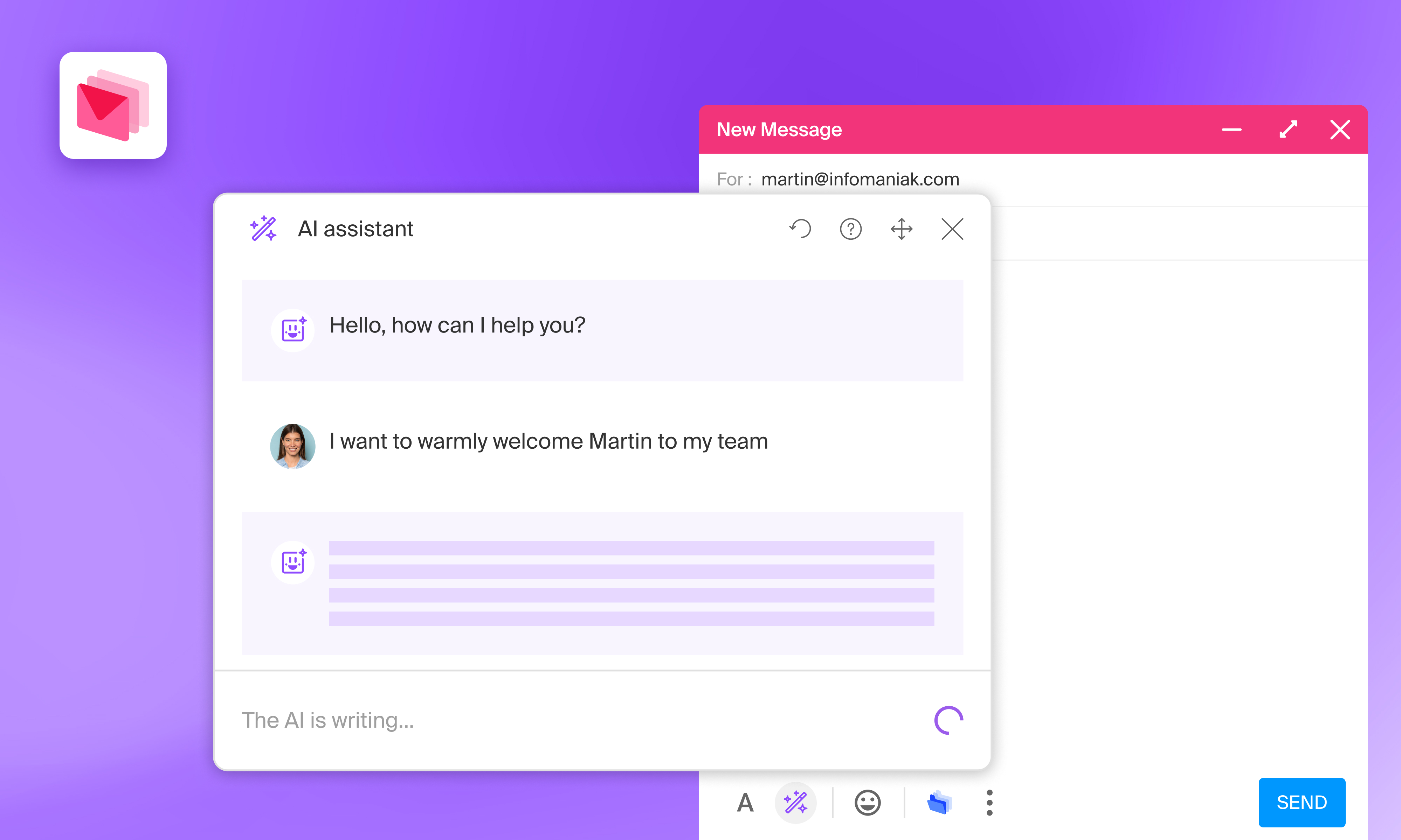Die im Mail-Service von Infomaniak implementierte KI beinhaltet einen Schreibassistenten, der über das Texteingabefenster einer Nachricht gestartet wird.