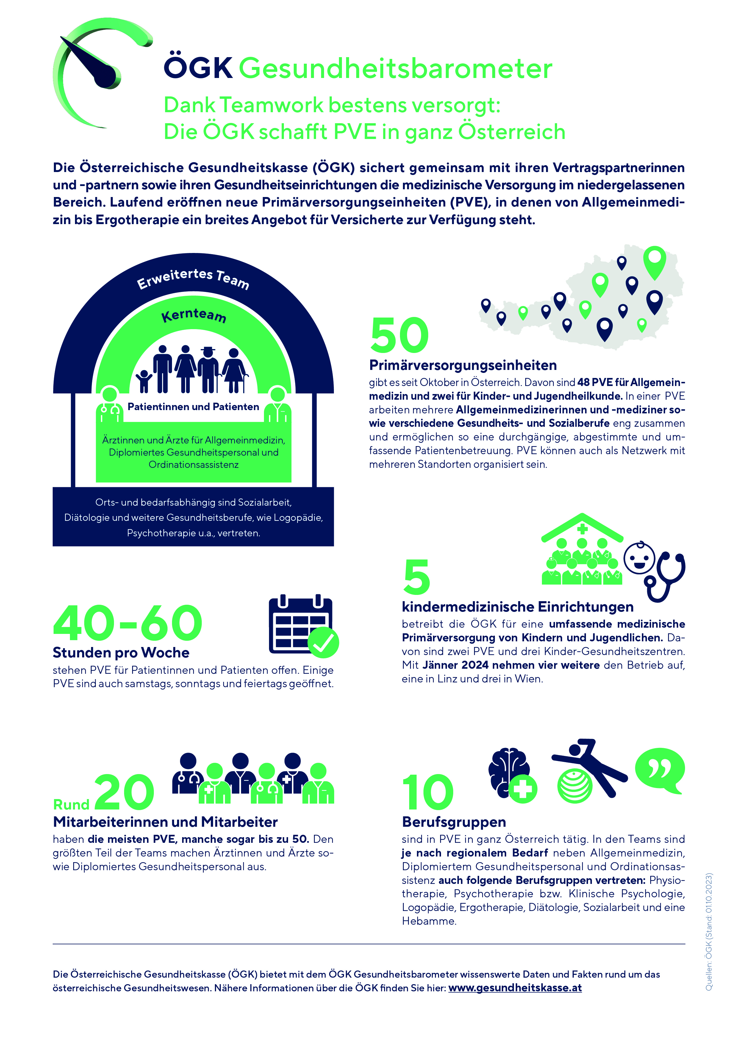 Die Österreichische Gesundheitskasse (ÖGK) zählt bereits 50 Primärversorgungseinheiten (PVE) in Österreich zu ihren Vertragspartnerinnen und -partnern. Diese bieten in Form von Zentren oder Netzwerken mit multidisziplinären Teams aus Allgemeinmedizinerinnen und -medizinern bzw. Kinderärztinnen und -ärzten sowie Pflegepersonen und - je nach Bedarf - weiteren Gesundheits- und Sozialberufen eine umfassende Gesundheitsversorgung.