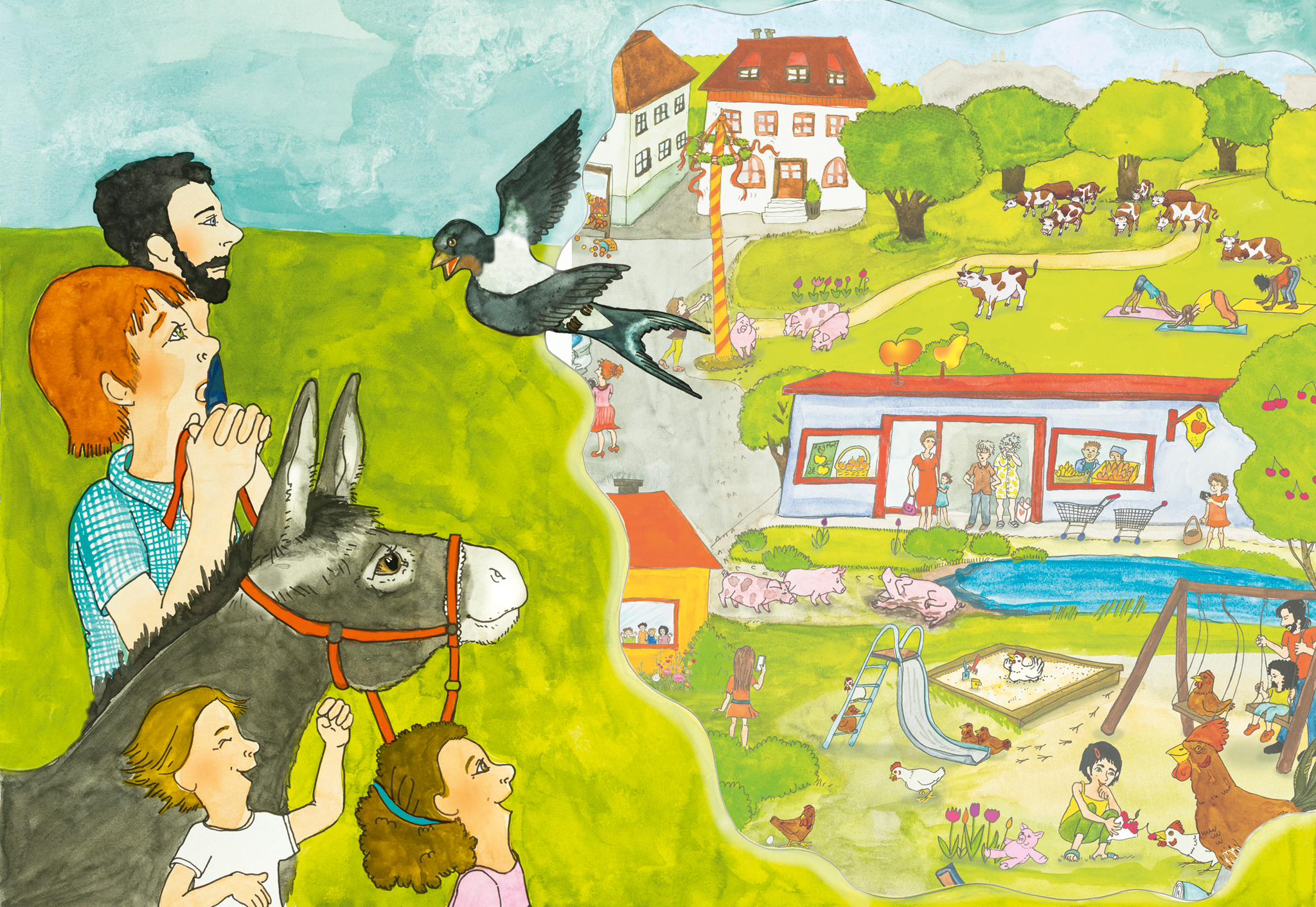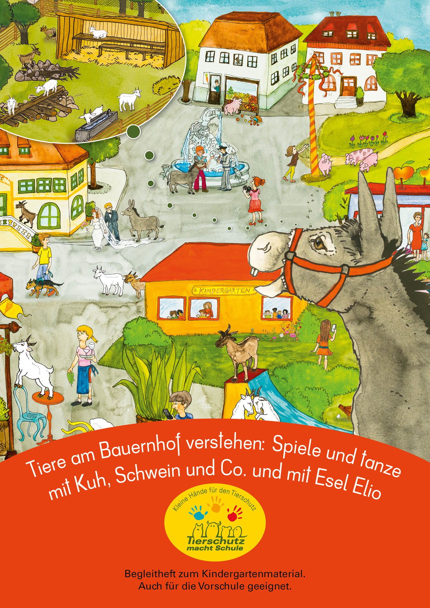 In der Geschichte öffnet der Esel Elio mit seinem Zaubertanz die Schlösser und Tore, sodass die Tiere, die immer nur im Stall sein müssen, endlich ins Freie kommen. Sie laufen in die Stadt und zeigen den Menschen, was sie zum guten Leben brauchen. Am Wimmelbild-Poster steigt zum Beispiel eine Ziege auf den Tisch, weil Ziegen das Klettern lieben. Ein Schwein liegt beim Teich im Schlamm, weil sich Schweine gerne suhlen, und ein Huhn hüpft in den Sandkasten, weil Hühner ihr Gefieder mit Sand reinigen. Die Zusehenden wissen nun, dass alle Nutztiere Bewegung im Freien brauchen. Deshalb helfen sie der Bäuerin, Auslauf und Weiden für die Tiere zu errichten.