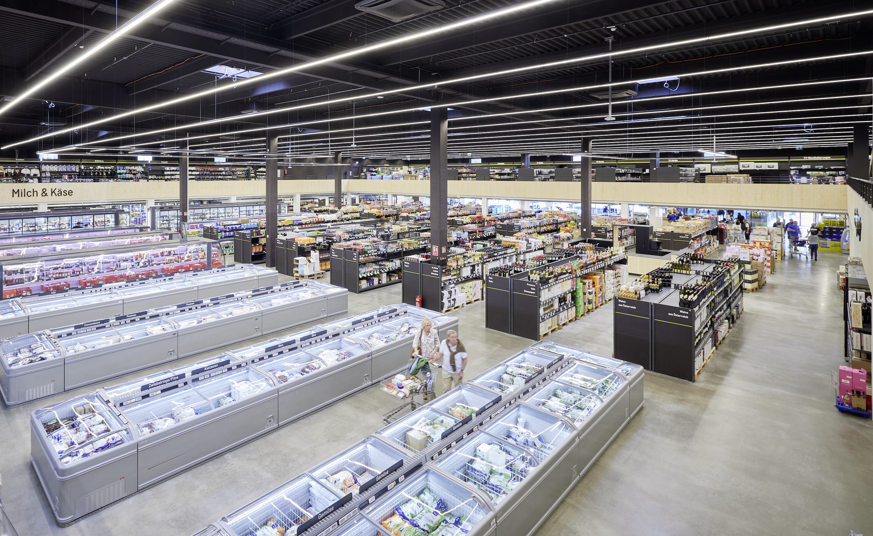 - Die Einkaufsatmosphäre auf der 8.182 m2 großen Verkaufsfläche lebt vom Wechselspiel der Produktanordnung in Hochregalbereichen und einem Atrium, das den ebenerdigen Frischebereich mit den Non Food-Sortimenten im ersten Obergeschoß verbindet.
