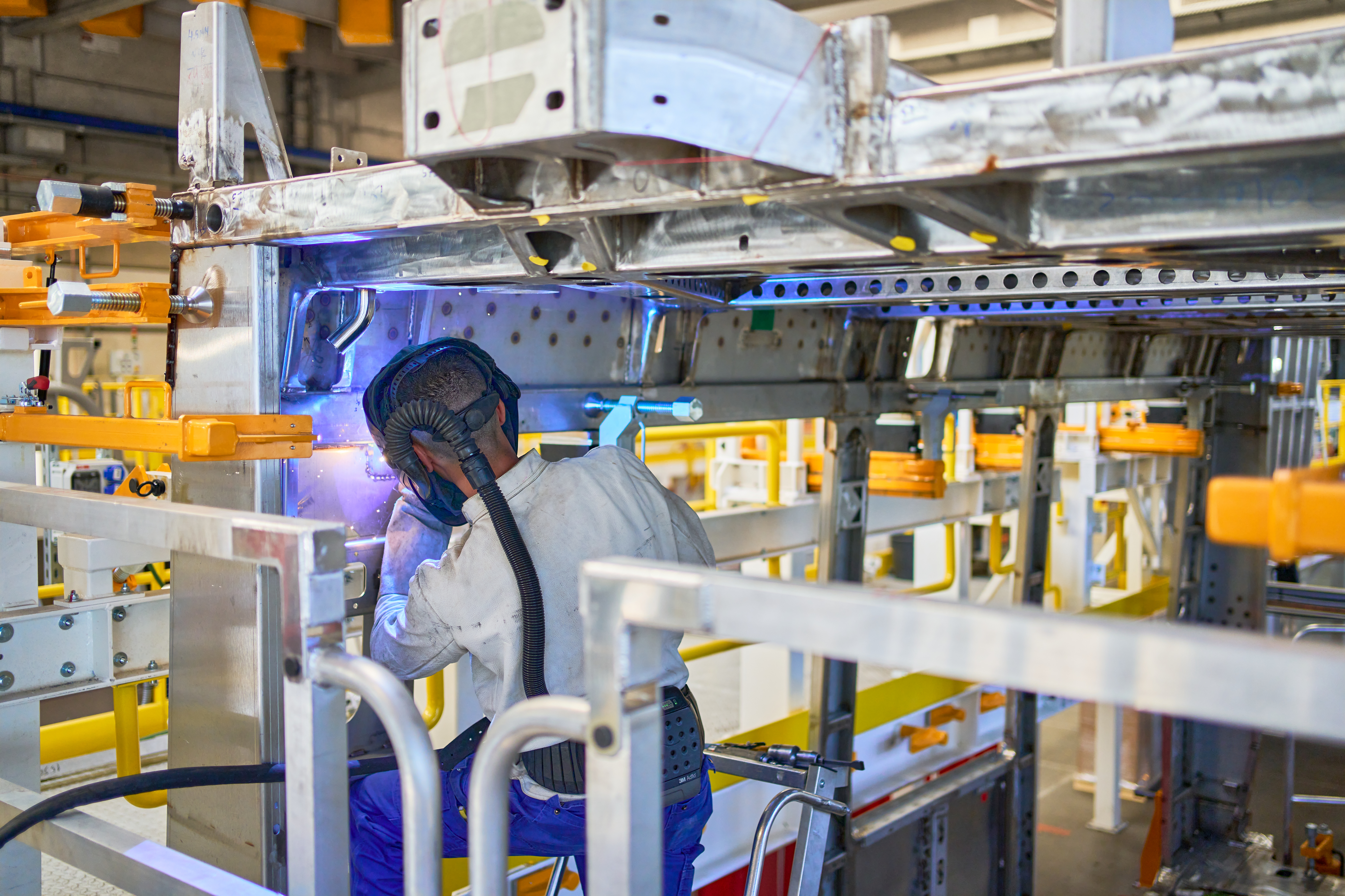 Um die Ausbringungsrate von 2,5 auf fünf Straßenbahnen pro Monat erhöhen zu können, wurde das neue, innovative Layout der Schweißhalle vor Ort entworfen und umgesetzt. Durch den Umbau wurden zwei separate Fertigungslinien geschaffen. Besonders wichtig war dem Unternehmen die Gesundheit der Mitarbeiter:innen. Die Schweißer:innen profitieren direkt durch die Rohbaukathedrale durch bessere Ergonomie und einer Minimierung der Arbeitszeit in kniender oder Überkopfposition.