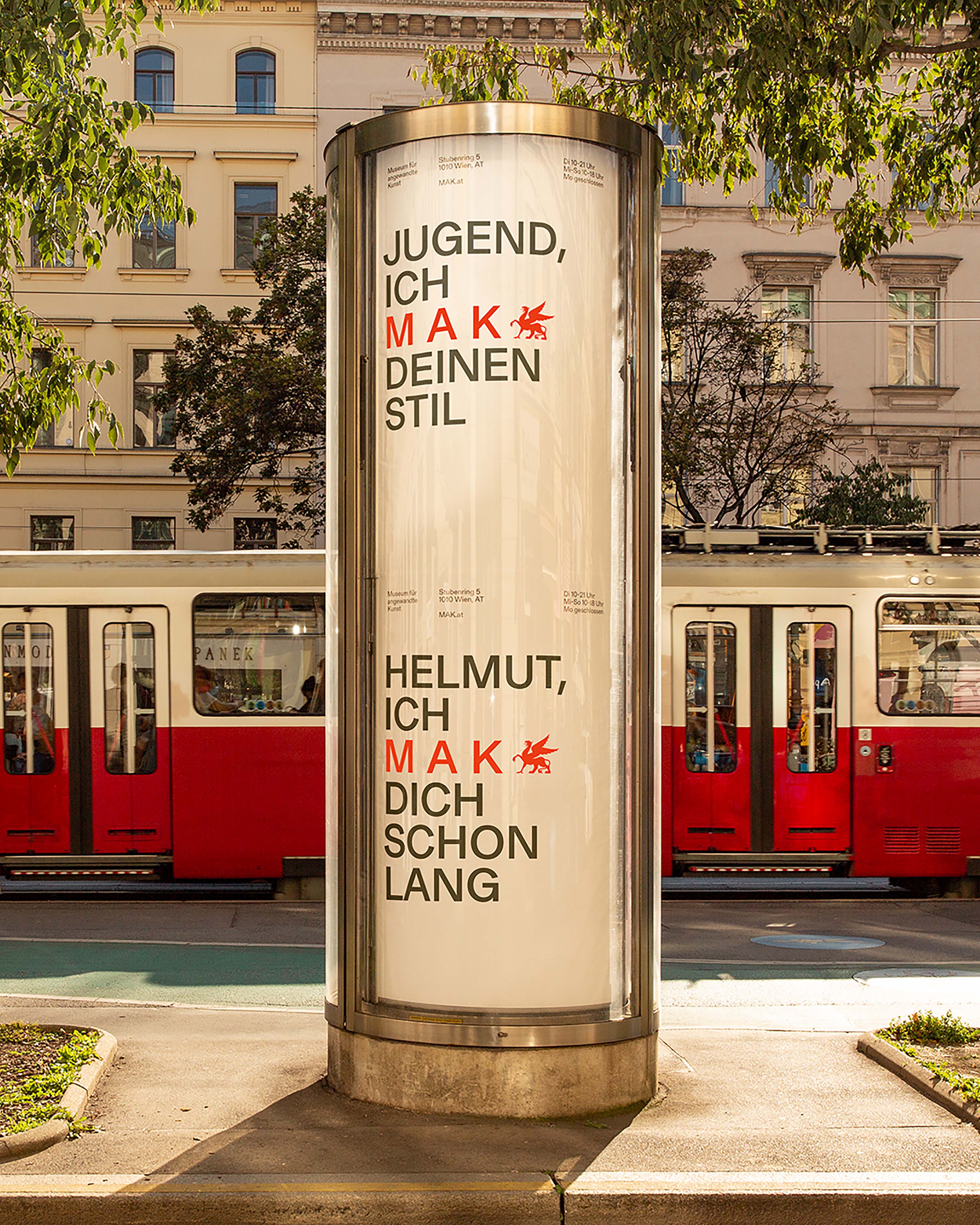 Ein einfaches Wortspiel ist die Grundidee der MAK Kampagne, die im Oktober 2022 ausgerollt wurde. „Ich MAK angewandte Kunst“, „Jugend, ich MAK Deinen Stil“ oder „Helmut, ich MAK dich schon lang“ heißt es etwa auf den zahlreichen Sujets, die für Print, Online und Out of Home (OOH) entwickelt wurden und auch über die diversen MAK-Kanäle on- und offline ausgespielt werden. Nach der ersten Kampagnenwelle, die bis ins Frühjahr 2023 dauerte, werden die Sujets punktuell über die nächsten Jahre eingesetzt und weiterentwickelt.