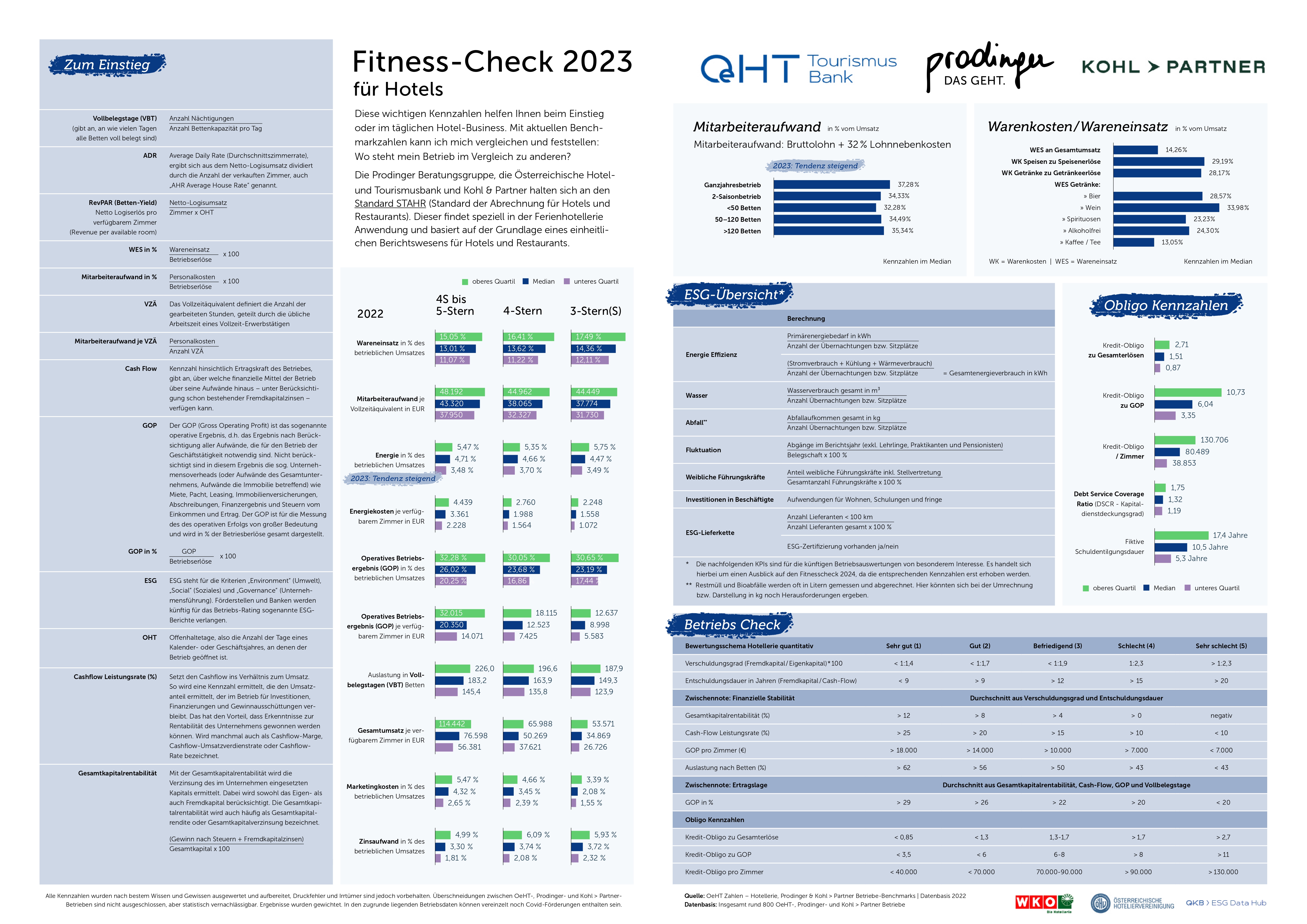 Der aktuelle Fitness-Check basiert auf den Daten von insgesamt fast 800 Hotelbetrieben. Diese Daten bilden die relevantesten verfügbaren Benchmarks (Vergleichswerte) für Hotelbetriebe in Österreich ab. Der Vergleich der eigenen Kennzahlen mit jenen der Mitbewerber (aufgegliedert nach Sterne-Kategorien) und der jeweiligen Top-Betriebe ist eine wichtige Voraussetzung jeder erfolgreichen Betriebsführung. Indem der Check bei der Analyse der betriebswirtschaftlichen Kennzahlen hilft, kann er die Weiterentwicklung eines Betriebes positiv beeinflussen.