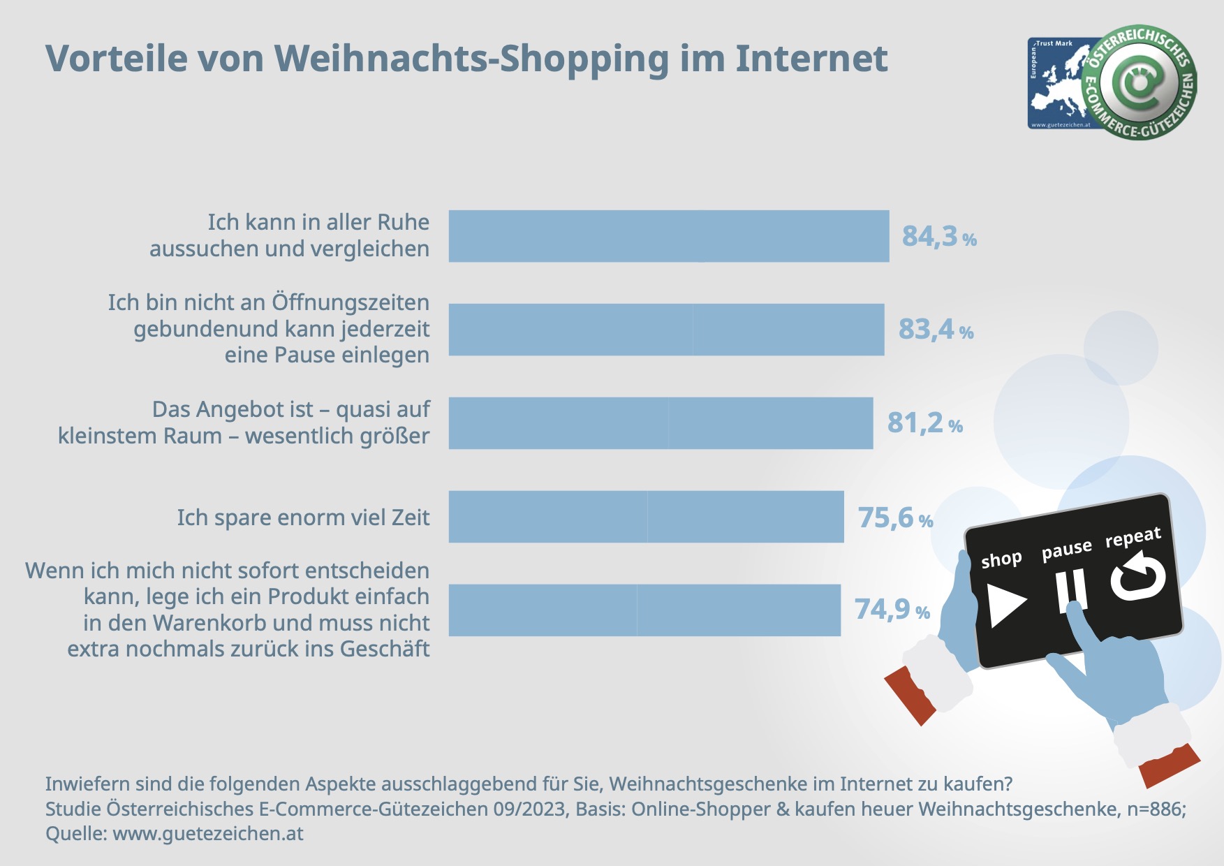 Österreichichs Konsumentinnen und Konsumenten schätzen am Online-Geschenkekauf besonders, dass sie in Ruhe aussuchen und vergleichen können (84 Prozent), wie das Österreichische E-Commerce-Gütezeichen in seiner aktuellen Studie herausgefunden hat. Weiters finden es die Befragten angenehm, nicht an Öffnungszeiten gebunden zu sein und nach Belieben Pausen einzulegen (83 Prozent). Ein deutlich größeres Angebot auf kleinstem Raum spricht ebenfalls für den Online-Kauf von Weihnachtspräsenten (81 Prozent). Ausschlaggebend ist auch die Zeitersparnis (76 Prozent), da mit nur wenigen Klicks aus einer breiten Palette von Produkten ausgewählt werden kann.
