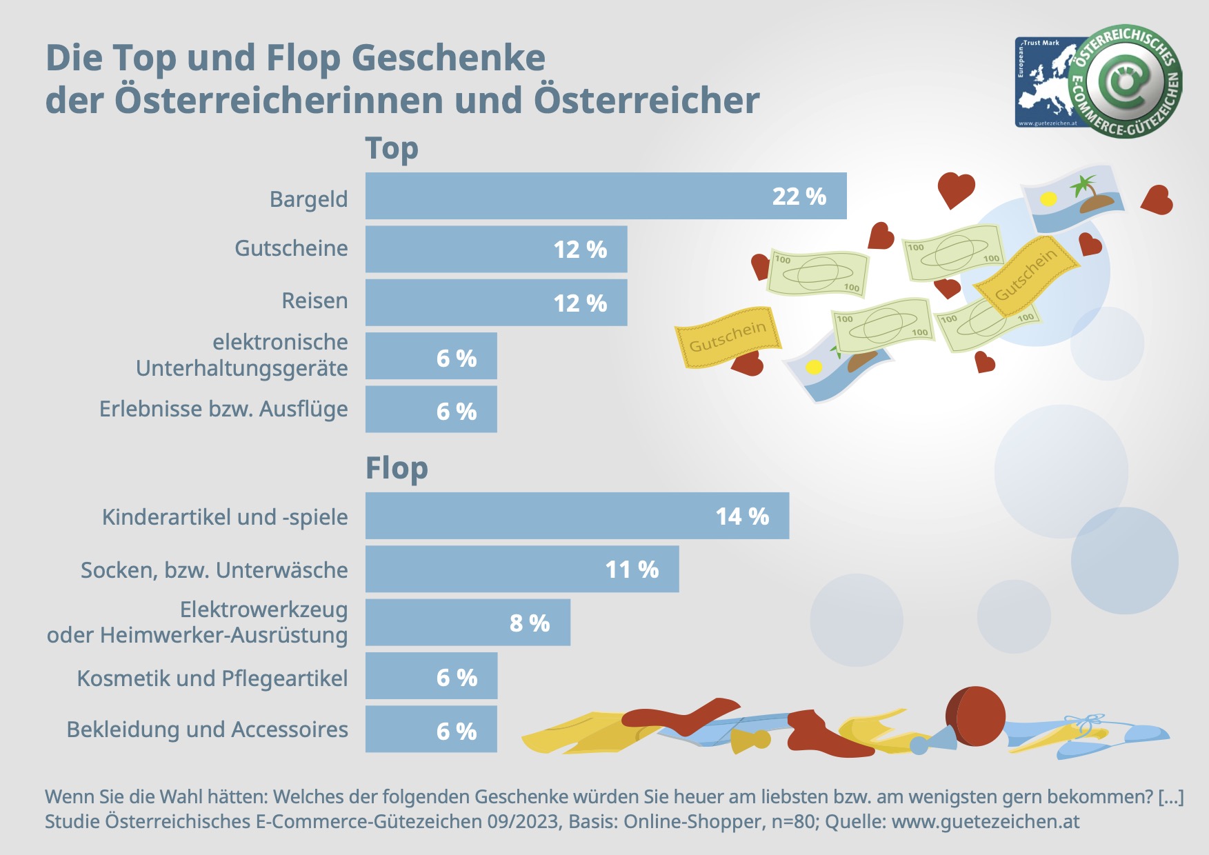 Die All-Zeit-Favoriten stehen auch dieses Jahr auf der Wunschliste ganz oben: Bargeld (22 Prozent) sowie Gutscheine und Reisen (je 12 Prozent). Weitere beliebte Geschenke der Österreicherinnen und Österreicher sind elektronische Unterhaltungsgeräte und Erlebnisse bzw. Ausflüge (je 6 Prozent).
