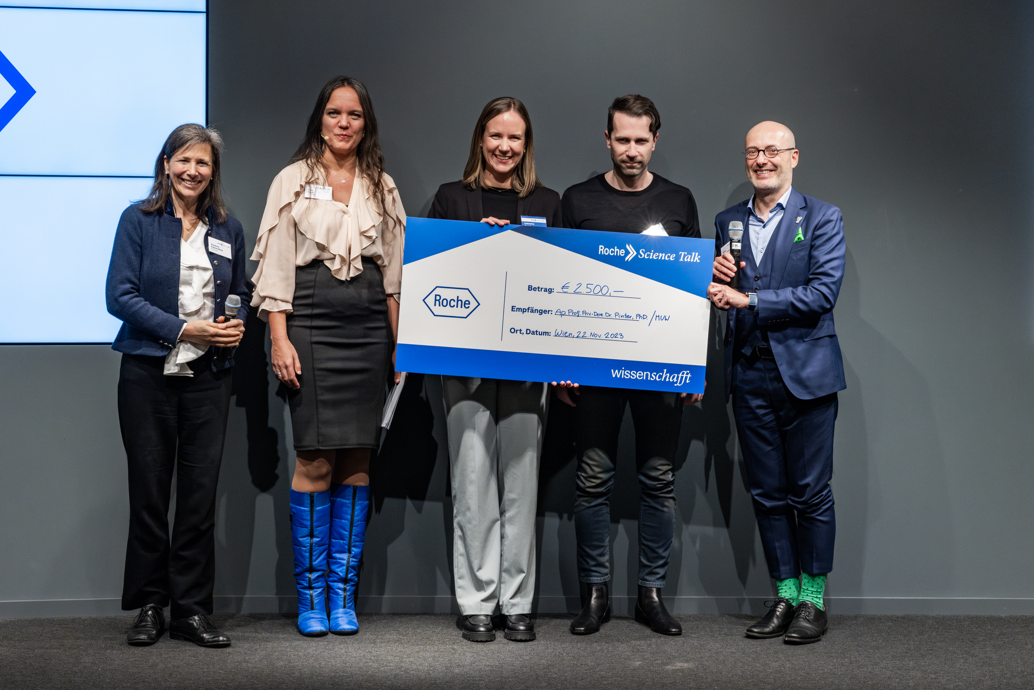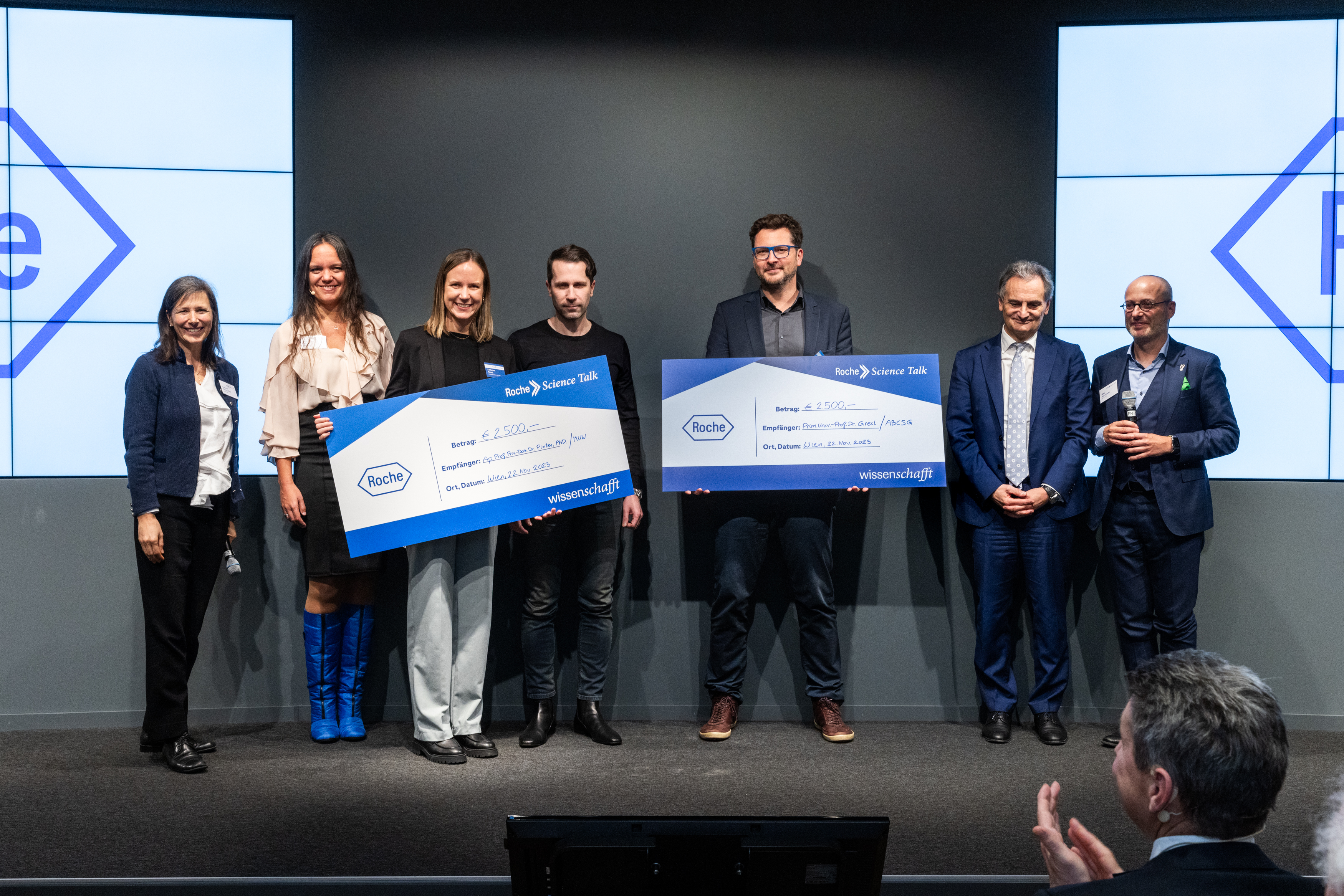Beim 5. Roche Science Talk präsentierte sich erneut die vielfältige Bandbreite der von Roche geförderten Forschungsprojekte aus unterschiedlichen Fachgebieten. Am Roche Standort in Wien wurden am 22. November 2023 zwei herausragende Projekte mit den Roche Science Awards prämiert. Der Roche Science Talk bietet eine Plattform für die österreichische Forschung und unterstützt wissenschaftliche Innovationen für Patient:innen. Dieses Jahr wurden die Auszeichnungen durch ein Voting aller Teilnehmer:innen (Roche Mitarbeitende ausgenommen) an Ap. Prof. Priv.-Doz. Dr. Matthias Pinter, PhD und Prim. Univ.-Prof. Dr. Richard Greil für herausragende Leistungen verliehen.
