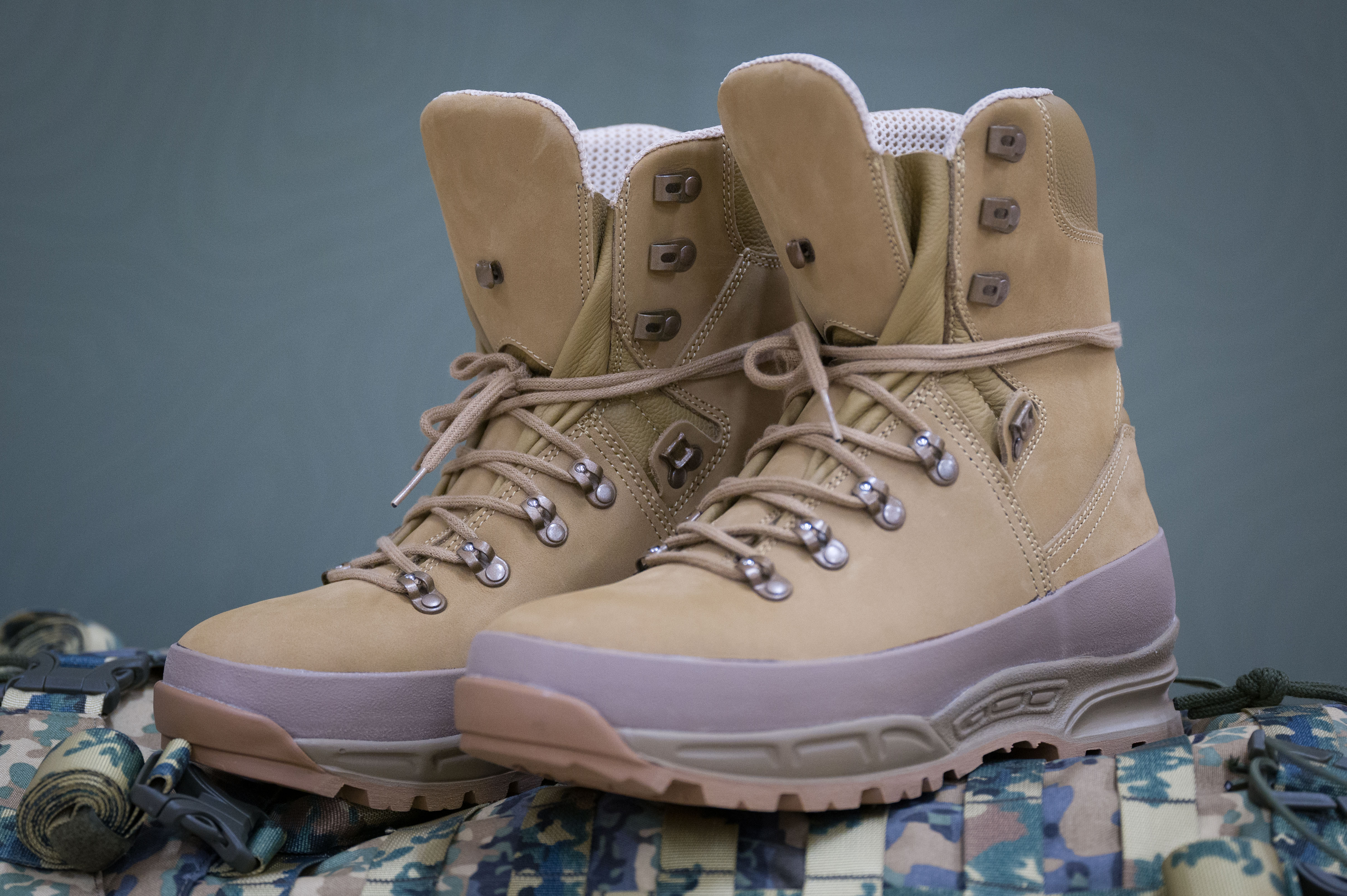 Der neue Kampfstiefel in der Farbe Beige wird höchsten Ansprüchen gerecht. Durch sein Textilfutter besitzt der neue Kampfstiefel eine hohe Scheuerbeständigkeit und nimmt Feuchtigkeit bestens auf, um den Fuß trocken zu halten. Für eine gute Dämpfung sorgt eine Sohle aus Polyurethan und Gummi sowie eine weiche Einlagesohle. Eine etwa acht Millimeter dicke Schaumstoffpolsterung umschließt den Fuß im Schaftbereich, um diesen bei kalten Temperaturen warm zu halten und entsprechende Stabilität im Gelände zu gewährleisten. Die Höhe des Schuhes beträgt etwa 20 cm bei mittlerer Größe und das Gewicht liegt bei ca. 1,9 Kilogramm je Paar.