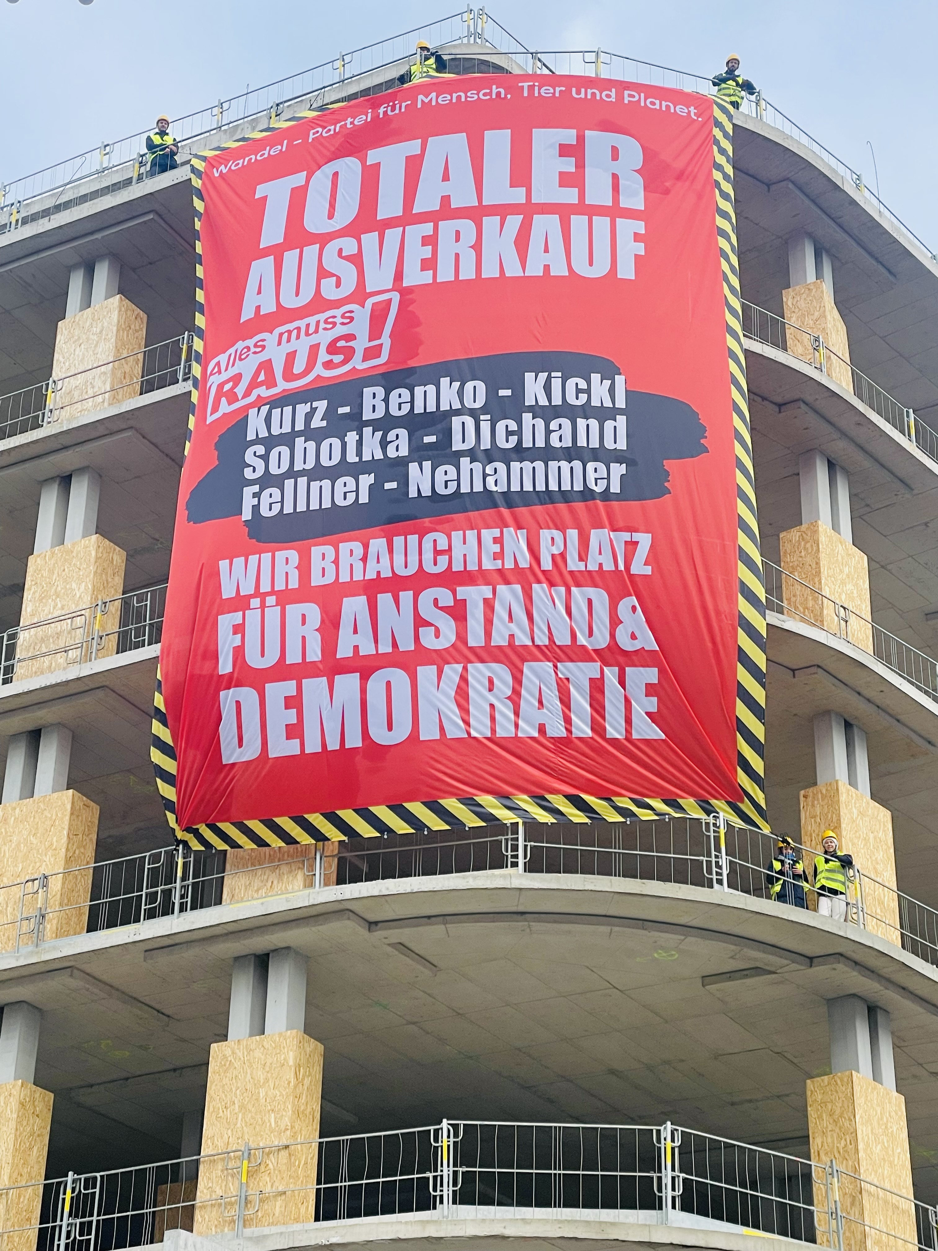 , so Wandel-Vorsitzender Fayad Mulla. Deshalb hat die Partei am Samstagmorgen dagegen protestiert und das verlassene, halb gebaute Gebäude mit einem eindeutigen Transparent beschmückt: "Alles muss raus: Kurz – Benko – Kickl – Sobotka – Dichand – Fellner – Nehammer. Wir brauchen Platz für Anstand und Demokratie."