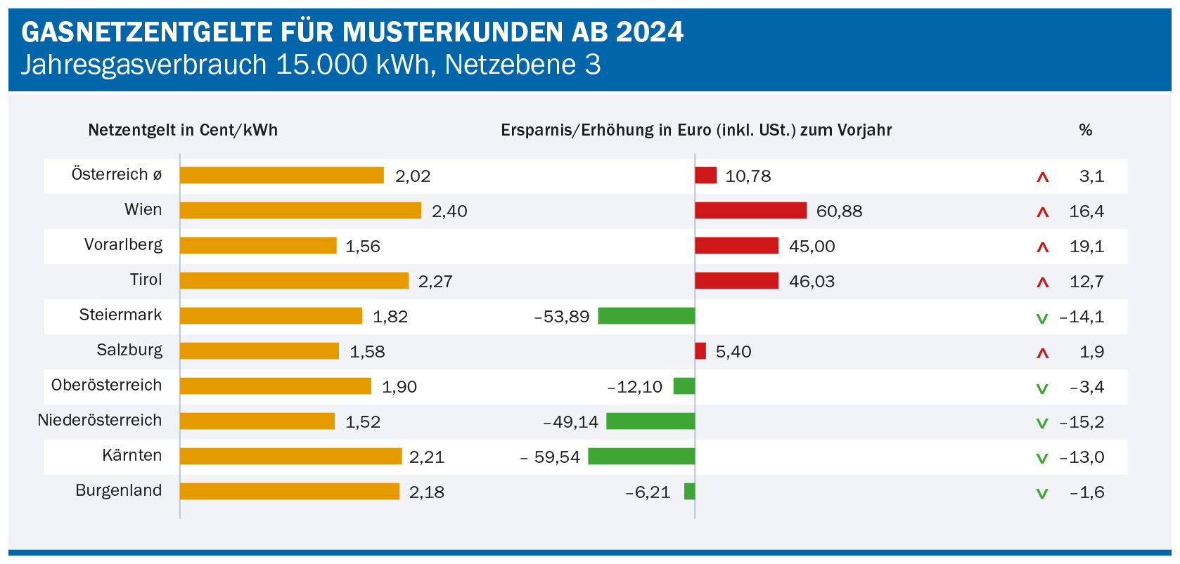 Grafik: Gasnetzentgelte für Musterkunden ab 2024; Quelle: E-Control