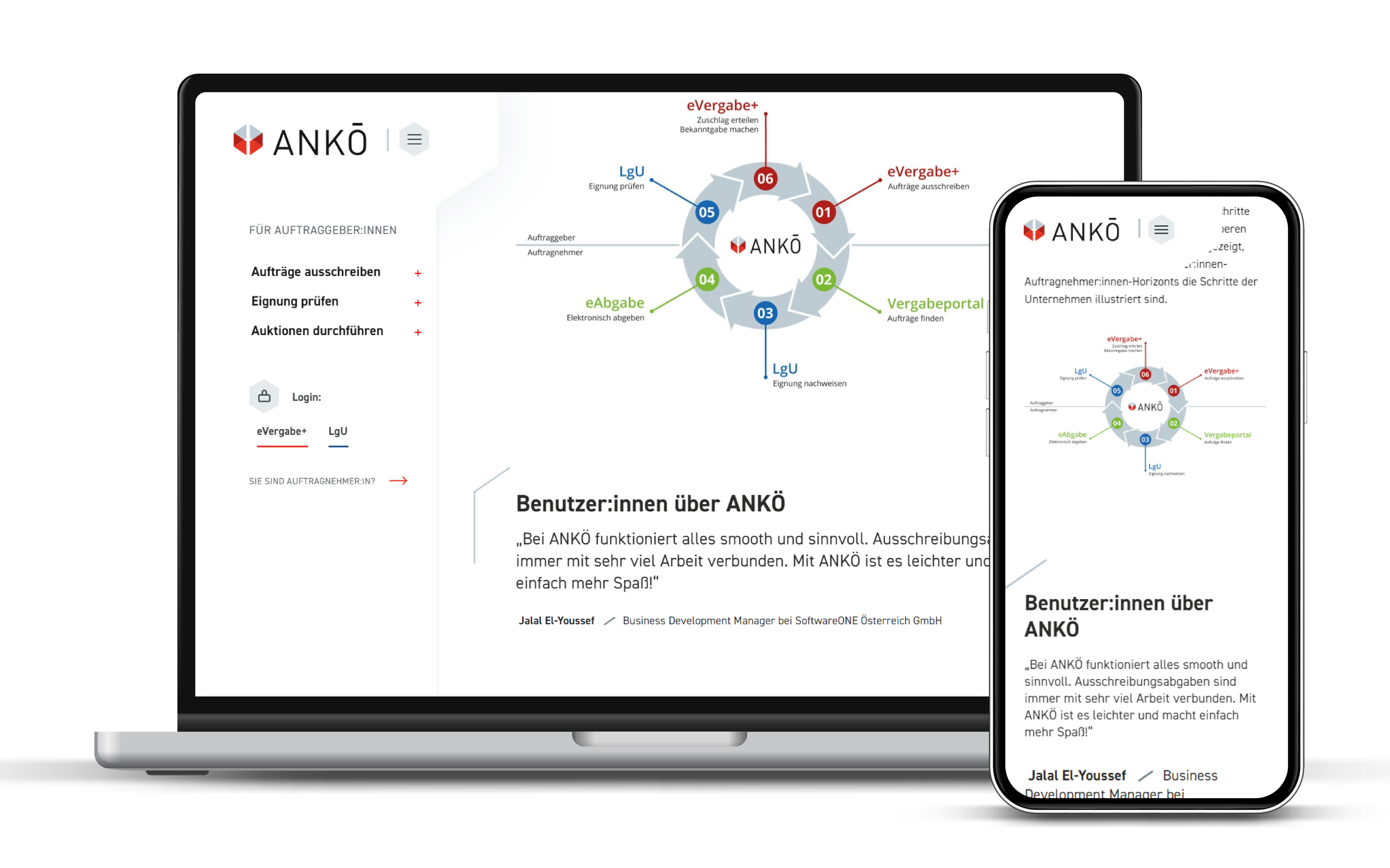 Emir Prcić: „Seit unserer Gründung im Jahr 1999 ist es der Zweck des ANKÖ und ebenso unserer Homepage die Effizienz, Transparenz und Einfachheit öffentlicher Vergaben in Österreich zu fördern. Wir sind auch in unserer neuen Page dem Weg treu geblieben, unsere Leistungen in zwei Hauptsektoren zu untergliedern – Leistungen für Auftraggeber:innen und Leistungen für Unternehmen. Innerhalb jedes dieser beiden Sektoren haben wir jedoch durch die immer gleiche Struktur Vorteile – Schritte – Leistungen – Kontakt – Broschüre eine neue Orientierungslogik geschaffen. So kann von jedem Produkt für jeglichen Bedarf der Zweck, die Vorteile und auch die Kosten sofort eingesehen werden.