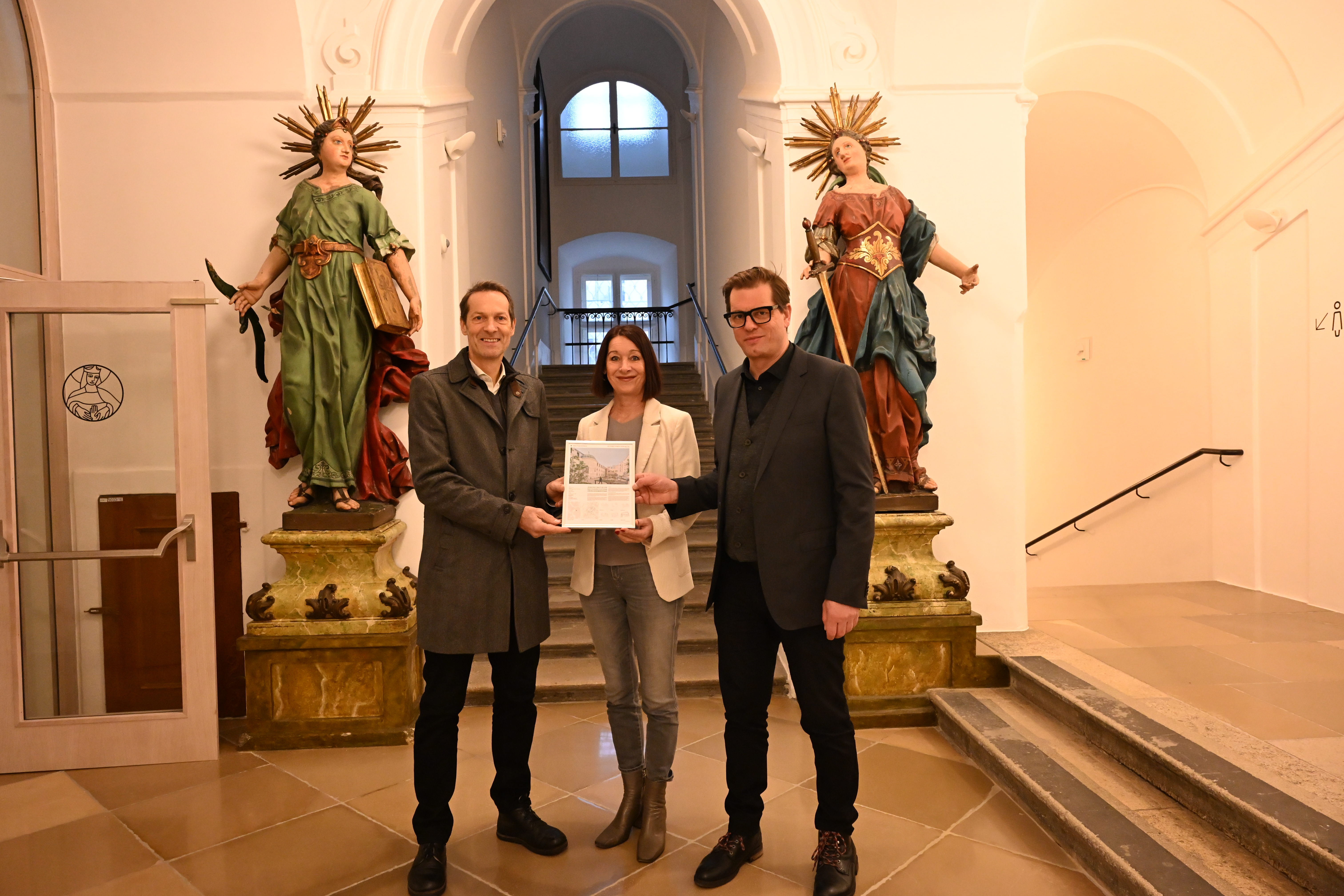 Markus Hiden, Geschäftsführer von Delta Pods Architects, und Wolfgang Kradischnig, Geschäftsführer innerhalb der DELTA Gruppe, beglückwünschten persönlich zu dieser besonderen Ehrung am Standort der Elisabethinen Wien-Mitte.