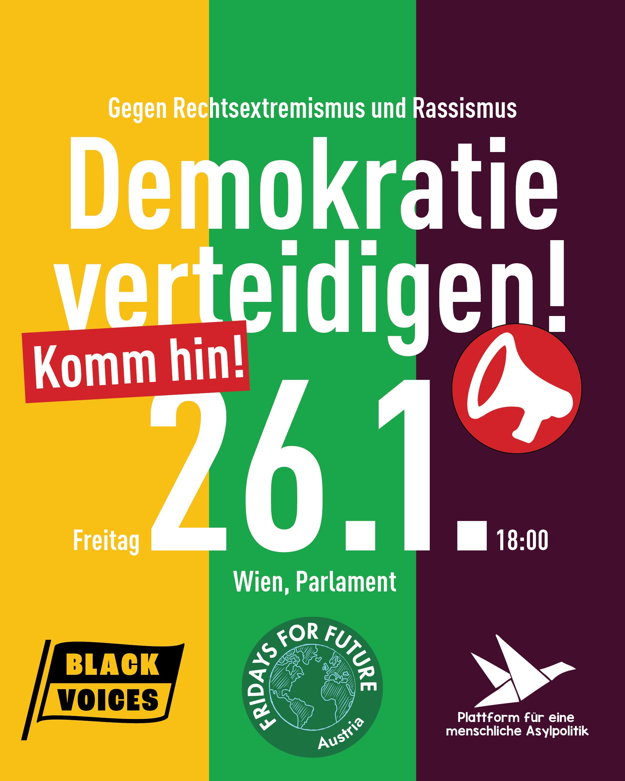 Daher rufen das Black Voices Austria, Fridays for Future und die Plattform für eine menschliche Asylpolitik zu einer Großkundgebung für unsere Demokratie, eine klimagerechte Zukunft und gegen Rechtsextremismus und Rassismus auf: