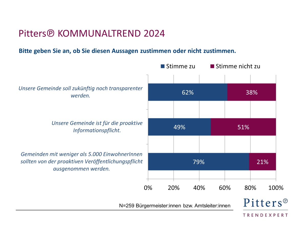 Im Rahmen des aktuellen Pitters℗ KOMMUNALTREND 2024 wurden von November bis Januar rund 250 Entscheidungsträger:innen in den Gemeinden befragt, wie sie das Informationsfreiheitsgesetz einschätzen. Knapp zwei Drittel der Gemeinden wollen in Zukunft noch transparenter werden. 49% der Bürgermeister:innen und Amtsleiter:innen geben an, dass ihre eigene Gemeinde eine proaktive Informationspflicht unterstützt, jedoch wird der damit einhergehende Verwaltungsmehraufwand kritisch gesehen. Vier von fünf Befragten (konkret 79%) sind der Ansicht, dass Gemeinden mit weniger als 5.000 EinwohnerInnen von der proaktiven Veröffentlichungspflicht ausgenommen werden sollten.