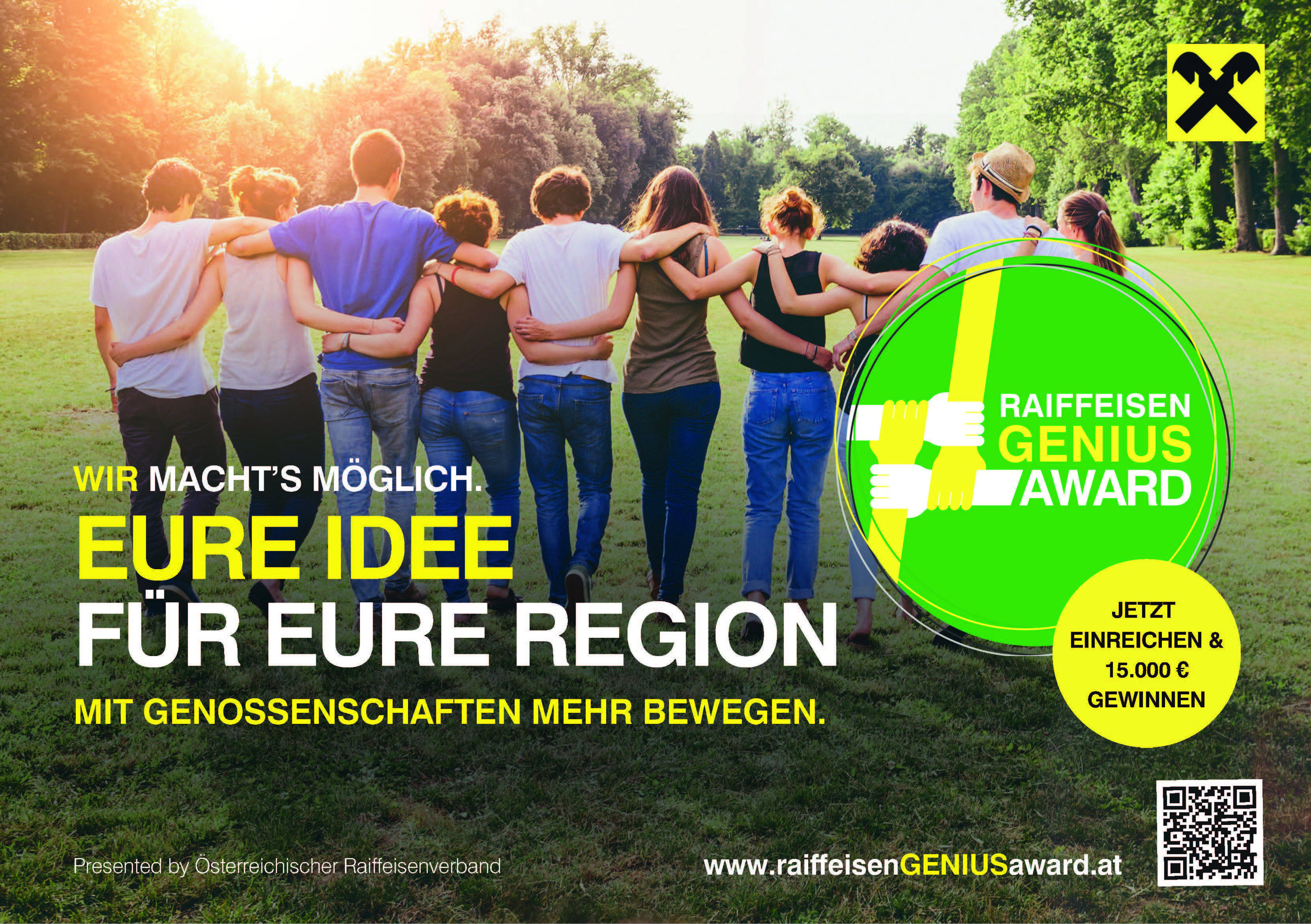 Mit einem österreichweiten Ideenwettbewerb für innovative, nachhaltige und gemeinschaftliche Projekte – dem Raiffeisen GENIUS Award – legt der Österreichische Raiffeisenverband (ÖRV) einen neuen Fokus auf das Thema Genossenschaft und Mitgliedschaft, um genossenschaftliche Ideen und vor allem ihre Bedeutung für die Regionen wieder stärker ins Bewusstsein zu rufen.