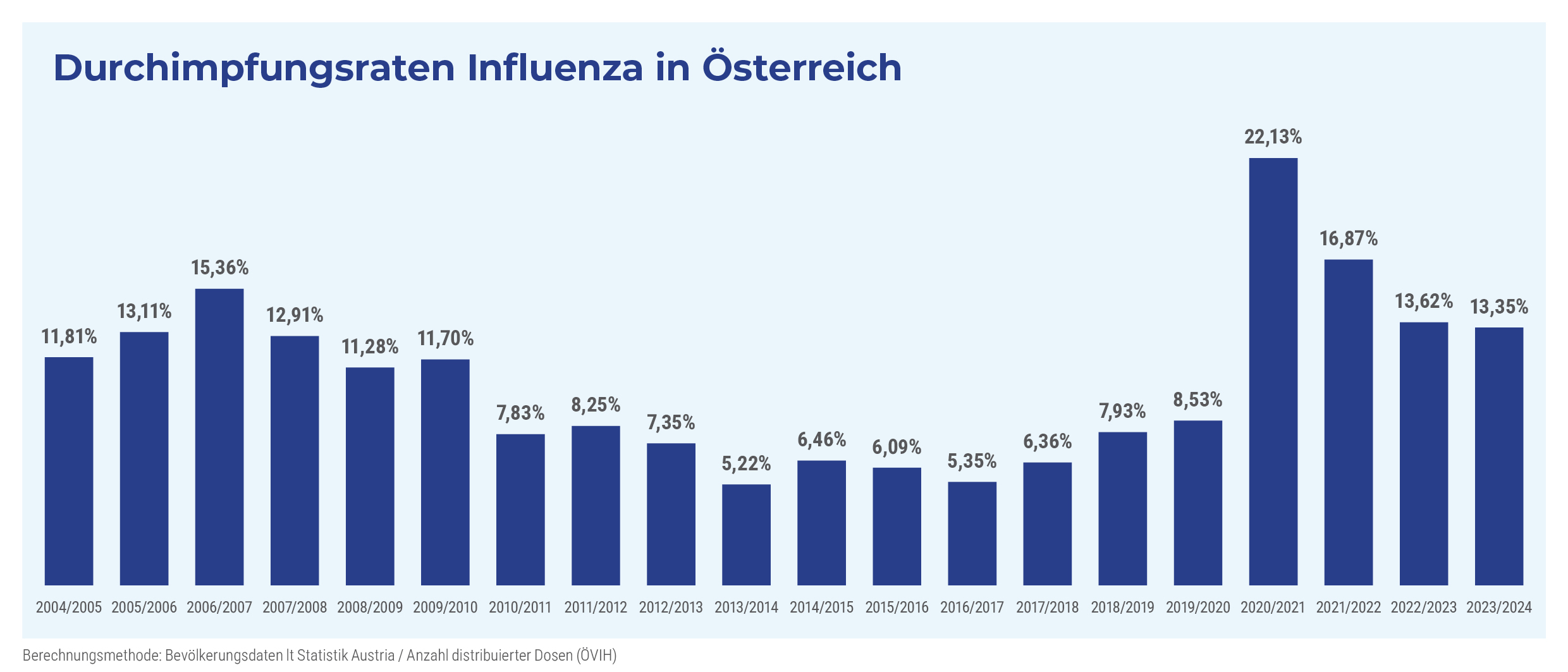Die Influenza-Impfung wird im Österreichischen Impfplan für vulnerable Gruppen ausdrücklich empfohlen, ebenso wie für alle anderen, die sich schützen wollen. [5] Für die Saison 2023/34 wurde erstmals ein öffentliches Impfprogramm für alle Bevölkerungsgruppen aufgelegt, in dem die Impfung allen Impfwilligen gegen Rezeptgebühr angeboten wurde. Begleitet wurde es von einer medialen Impfkampagne.