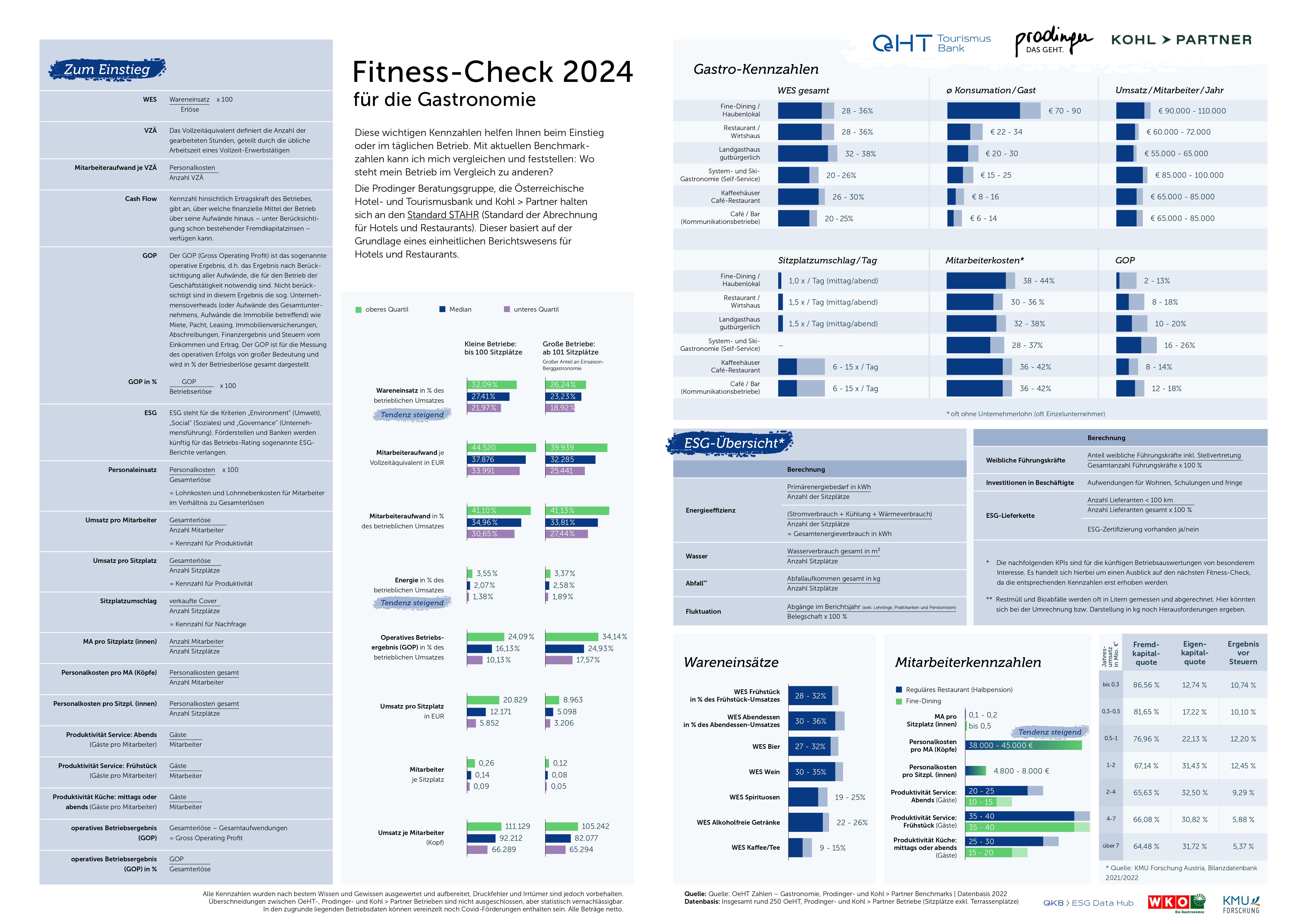 Der Fitness-Check für die Gastronomie, der nun zum zweiten Mal von der OeHT in Kooperation mit Prodinger und Kohl > Partner veröffentlicht wird, bietet Gastronomiebetrieben - von Haubenlokalen bis hin zu Kaffeehäusern - aktuelle Benchmarks, Analysen und Vergleichswerte. Dieser umfassende Branchenvergleich enthält die neuesten Kennzahlen und basiert auf dem STAHR-Standard (Standard der Abrechnung für Hotels und Restaurants), einem Berichtswesen, das speziell für die Ferienhotellerie und Gastronomie entwickelt wurde.