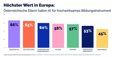 In Österreich sind 66% der Eltern der Meinung, dass KI ein hochwirksames Bildungsinstrument ist. Dieser Wert ist der Spitzenwert im europäischen Vergleich - Schlusslicht ist Frankreich mit nur 45%.