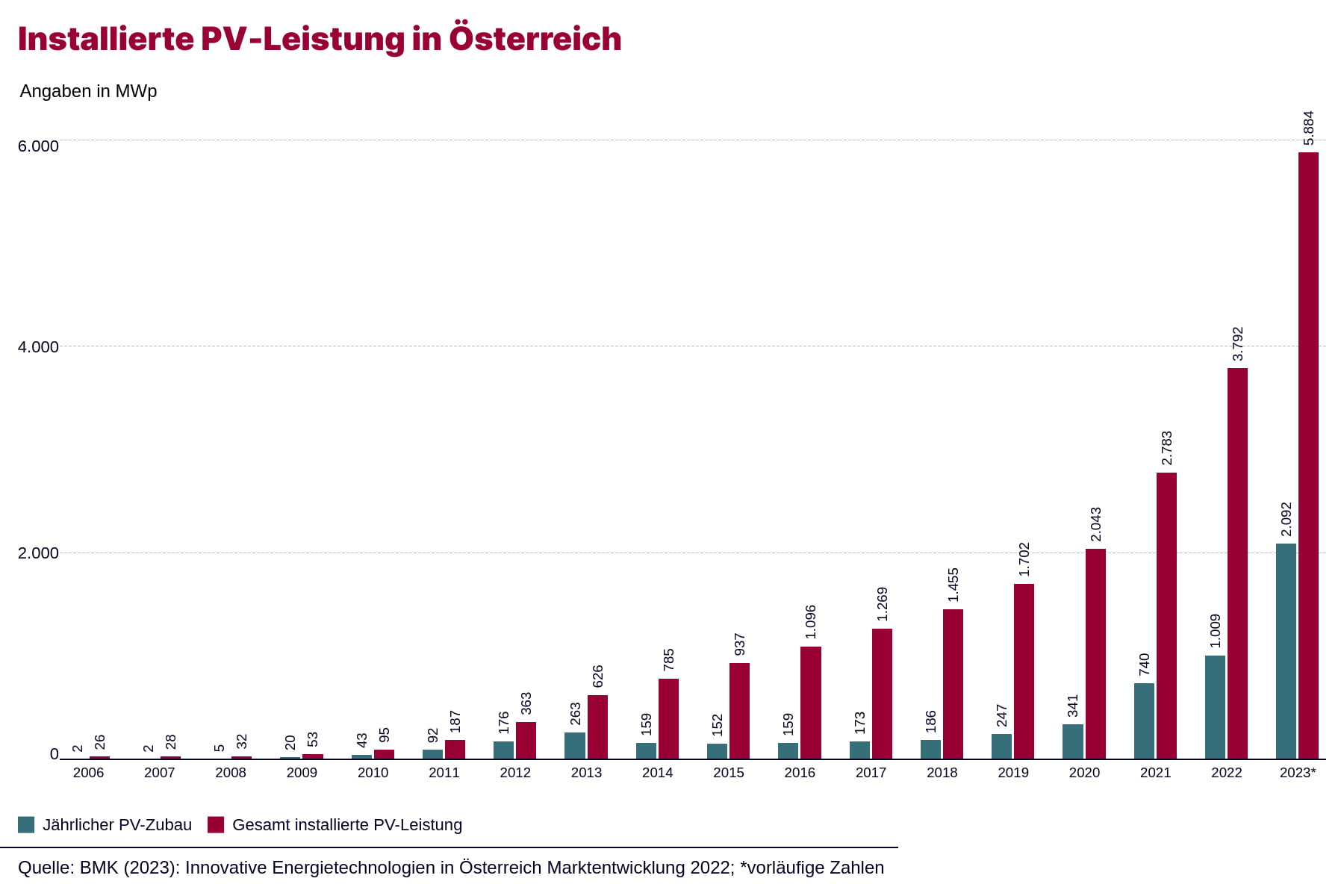 Solarstrom boomt: Allein im letzten Jahr sind österreichweit Photovoltaikanlagen mit einer Gesamtleistung von 2.000 Megawatt neu errichtet worden. Zum Jahresbeginn 2024 waren damit bundesweit 5.884 Megawatt (MWp) PV-Leistung installiert. Ein Viertel aller Anlagen befindet sich in Niederösterreich. Dort wurden bisher 98.000 Anlagen errichtet, 35.300 davon erst im vergangenen Jahr. Und damit ist noch lange nicht Schluss, denn der PV-Ausbau wird weiter massiv vorangetrieben: Bis zum Jahr 2030 ist bundesweit eine Vervierfachung der installierten Gesamtleistung auf insgesamt 21.000 Megawatt Peak geplant. Photovoltaikanlagen sollen dann jährlich 21 Terrawattstunden Energie liefern – das entspricht fast einem Drittel des österreichischen Gesamtstromverbrauchs von derzeit 71 Terrawattstunden pro Jahr.