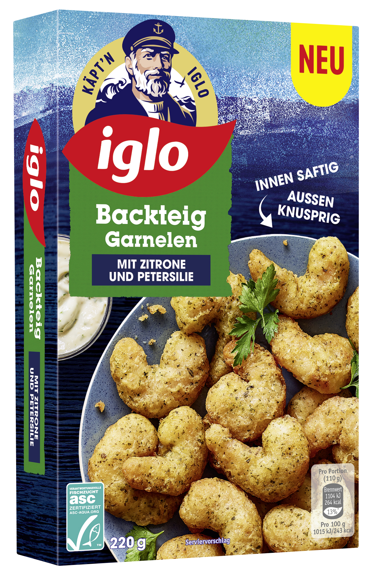 Mit seinen Steckenpferden Fisch und Meeresfrüchte ist Käpt‘n Iglo auch im neuen Jahr wieder auf Innovationskurs. Neben den beliebten iglo ASC Königsgarnelen sind nun auch die ASC Backteiggarnelen mit Zitrone und Petersilie im Kühlregal zu finden. Sie eignen sich als Topping für Salat, als Vorspeise mit Dip, mit Pasta, Erdäpfeln oder einfach als Snack. Was die Backteiggarnelen zusätzlich auszeichnet: Es werden ausschließlich ASC zertifizierte Garnelen und die besten Zutaten verwendet.
