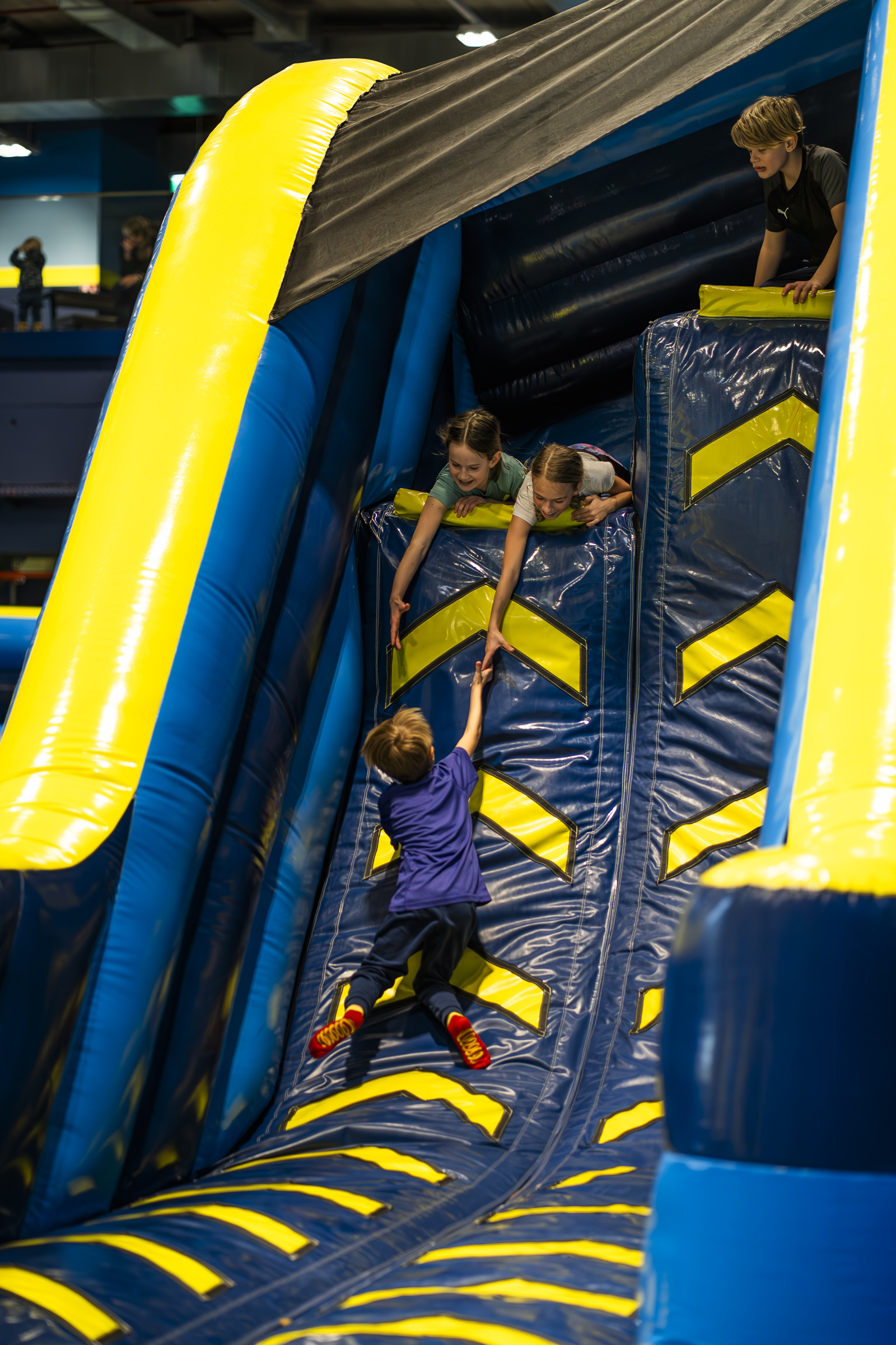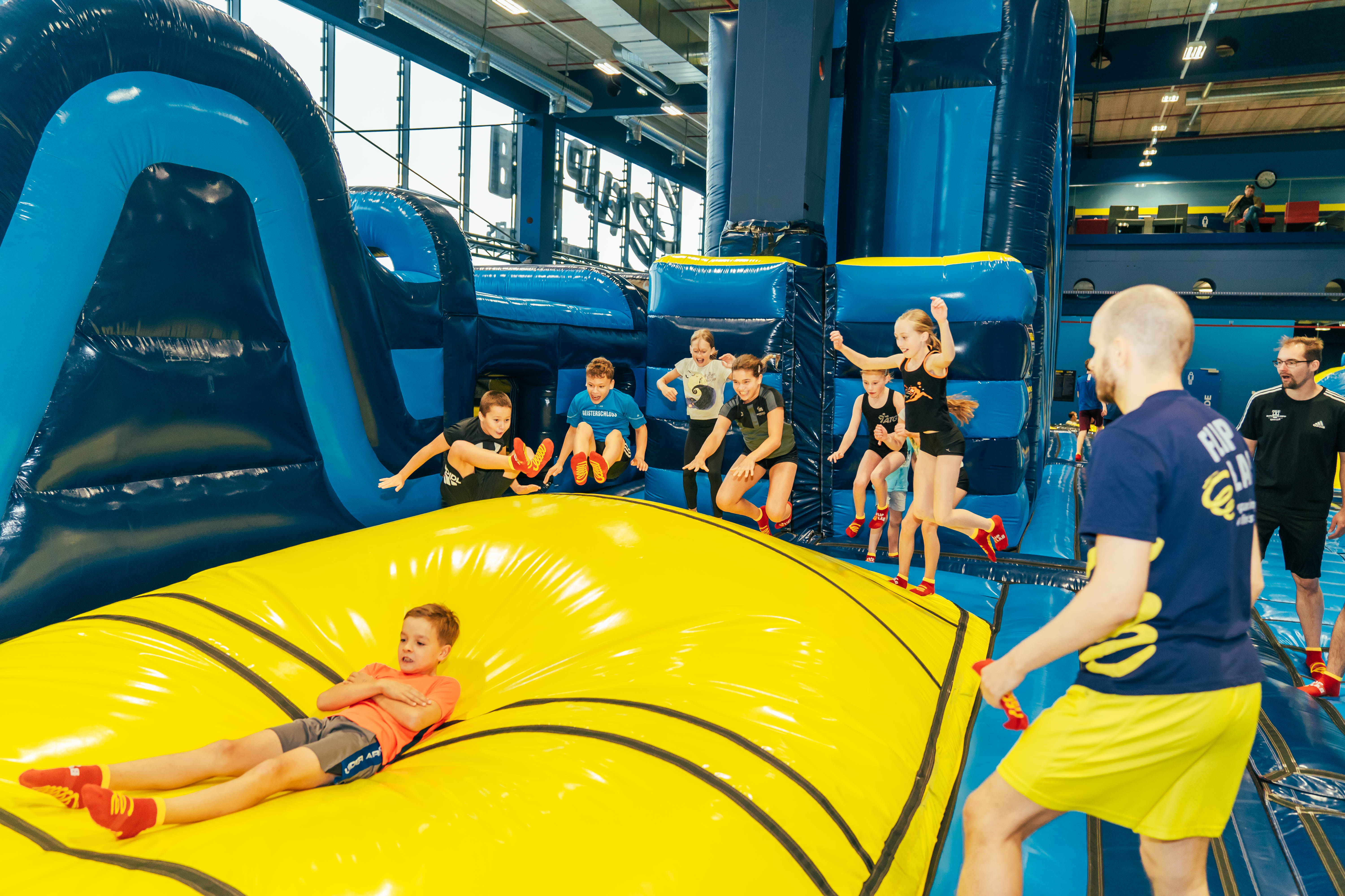 Im Obergeschoss erstreckt sich eine gigantische Spielwelt über die komplette Ebene und markiert die größte Hüpfburgwelt in Europa. Neben actionreichen Kletter-, Hüpf- und Rutschmöglichkeiten bietet das FLIP LAB auch eine Junior Zone mit Bällebad und XXL-Bausteinen für die kleinsten Gäste (unter 1 m Körpergröße).