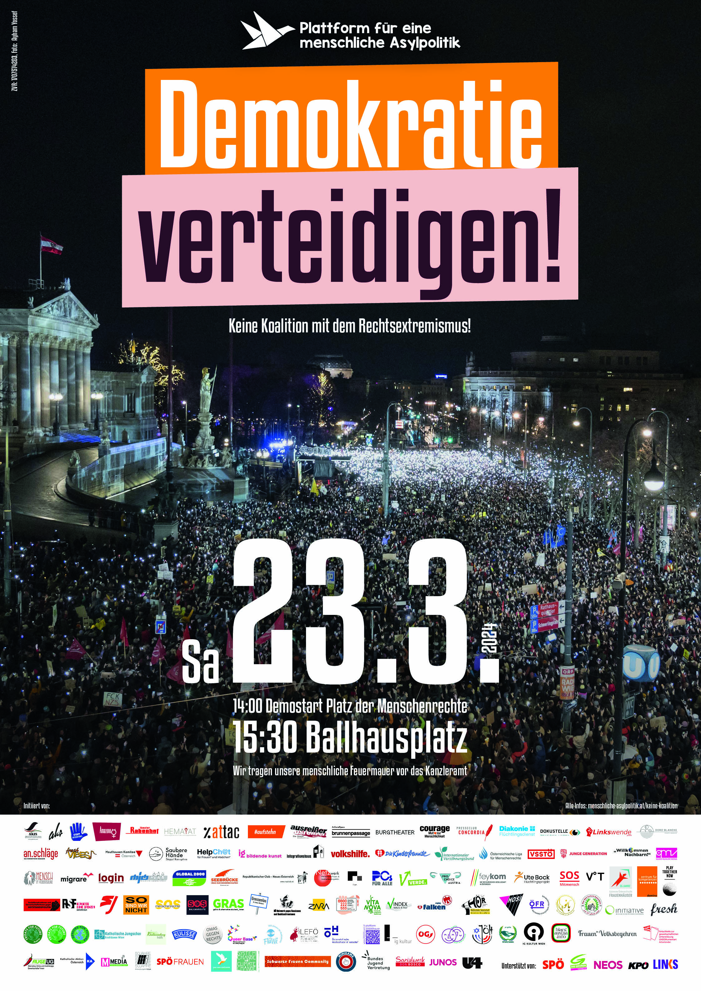Ein breites Bündnis von über 120 Organisationen der Zivilgesellschaft mobilisiert zur Demo, die sich um 14:00 Uhr am Platz der Menschenrechte trifft und die menschliche Feuermauer gegen Rechtsextremismus zur Großkundgebung ab 15:30 Uhr auf den Ballhausplatz bildet.