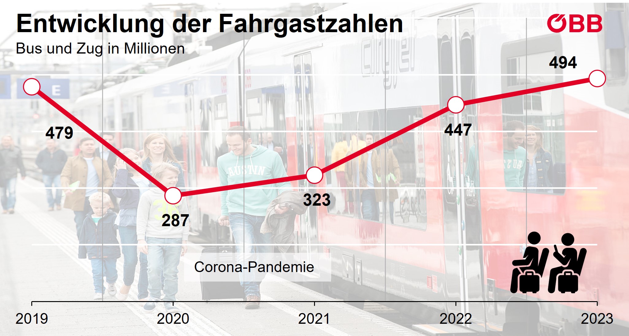 Die ÖBB haben sich trotz Energiekrise, hoher Inflation und Wirtschaftsabschwung im Geschäftsjahr 2023 wirtschaftlich gut behaupten können. Hauptverantwortlich dafür ist die positive Fahrgastentwicklung: Knapp 494 Mio. Menschen sind im vergangenen Jahr mit dem Zug bzw. mit dem Bus gefahren, 10,5 % mehr als 2022 und mehr als je zuvor. Insgesamt konnte der ÖBB Konzern im Jahr 2023 ein solides Plus erwirtschaften - das Ergebnis vor Steuern (EBT) beträgt 111,6 Mio. Euro. Es liegt um 42,2 % unter 2022 (193,2 Mio. Euro), wobei das Ergebnis aufgrund eines Sondereffekts im Jahr 2022 schwer vergleichbar ist.