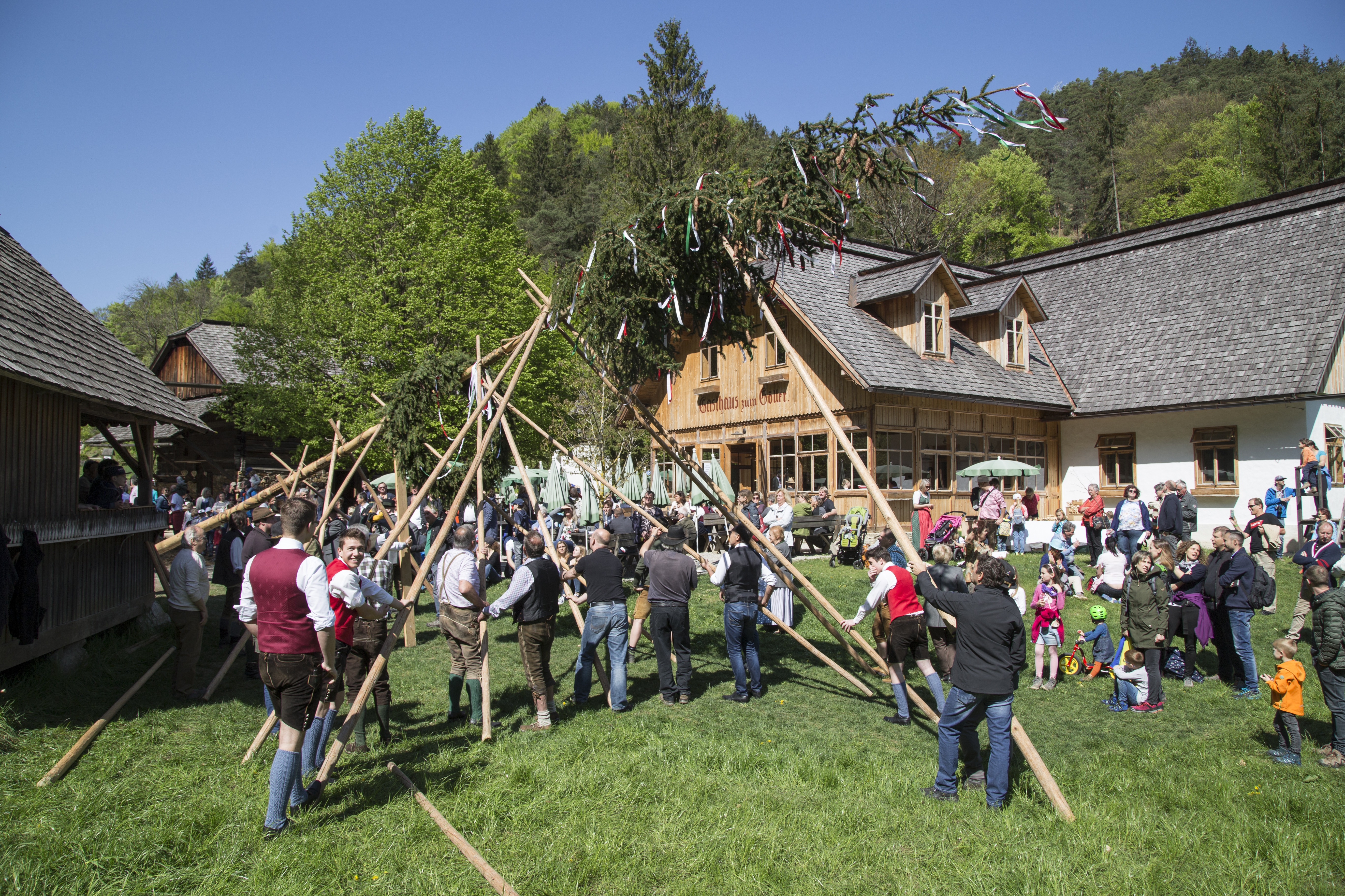 Ab 9 Uhr können sich die jungen Besucher*innen bereits beim Museumseingang versammeln, am Maibaum aufsitzen und sich vom Traktor zum „Dorfplatz“ nahe des Museumsgasthauses bringen lassen. An den Vortagen wird der Maibaum entrindet, mit kunstvollen Schnitzereien verziert und mit einem gebundenen, geschmückten Kranz versehen. Das Aufstellen selbst dauert seine Zeit und fordert einiges an Muskelkraft, denn der kunstvoll geschnitzte Baum hat einen starken Durchmesser und wird mithilfe von „Scherstangen“ aufgestellt.