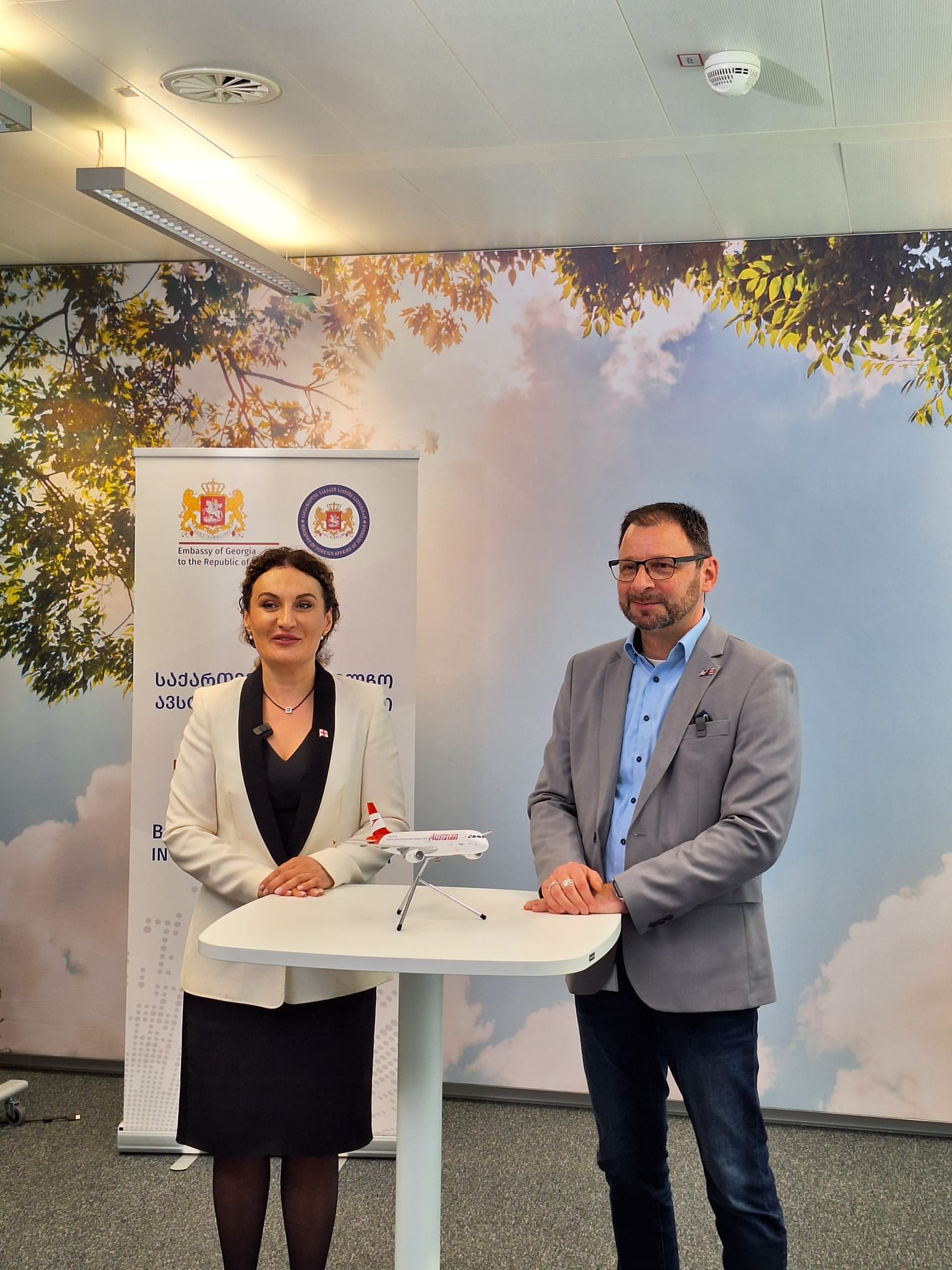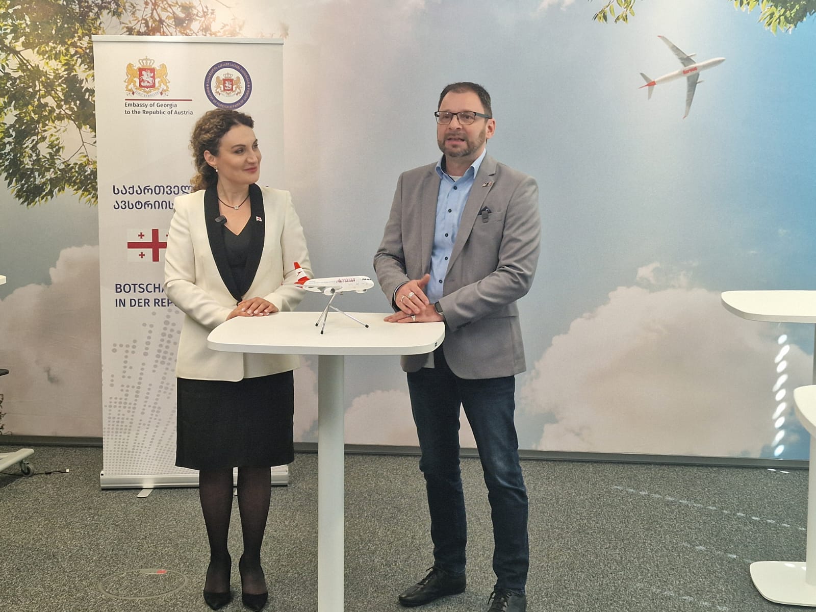 Die Wiederaufnahme direkter Flüge hat am 30. April I.E. Ketevan Tsikhelashvili, Botschafterin von Georgien in Österreich gemeinsam mit Herrn Stephan Linhart, Leiter Sales East Europe & Israel bei AUA in einer Videobotschaft (klicken Sie den Hyperlink) aus dem Wiener Flughafen begrüßt.